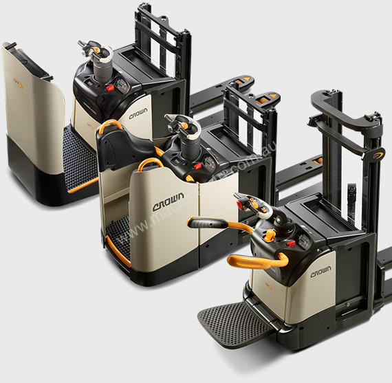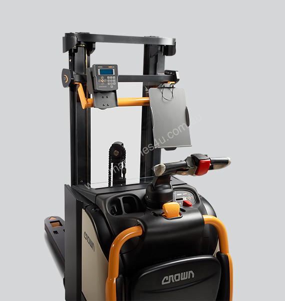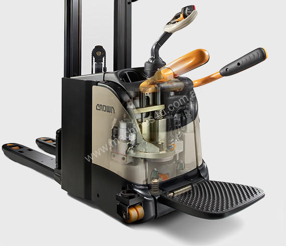 The DT double stacker with Crown’s exclusive fold-up FlexRide platform allowing operators to select between rider or pedestrian functionality.