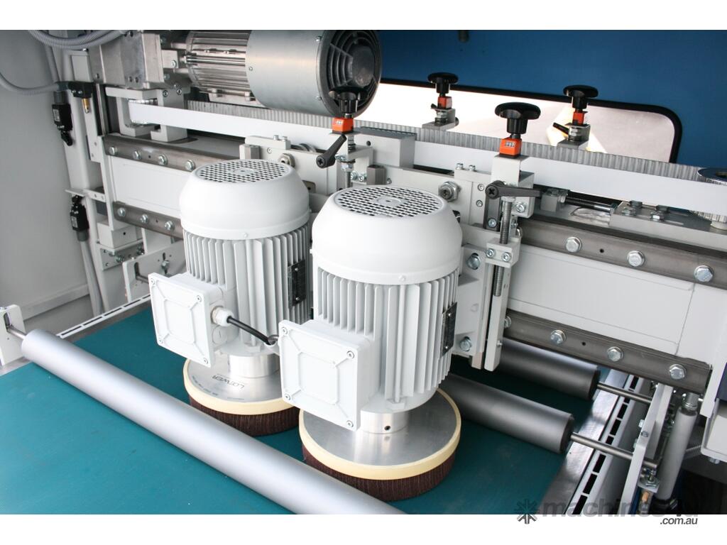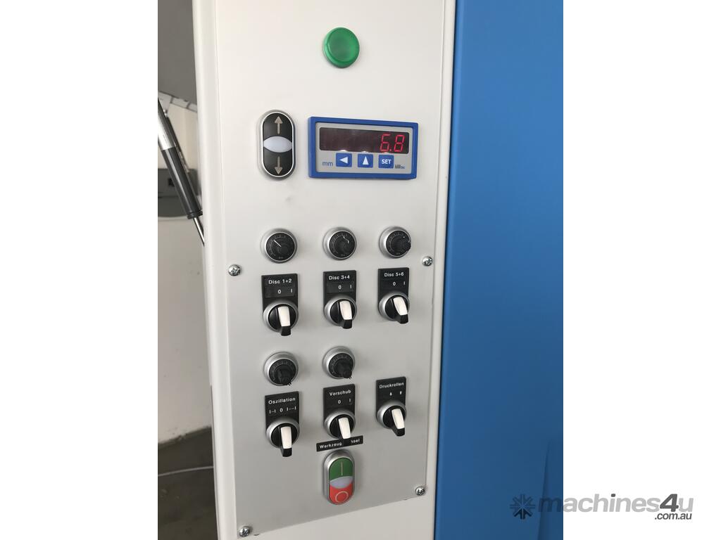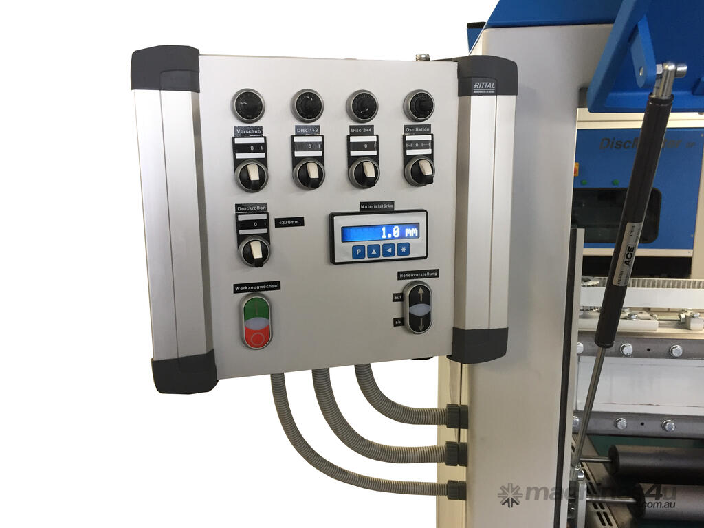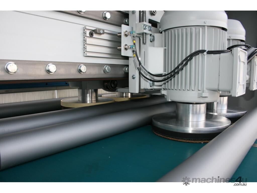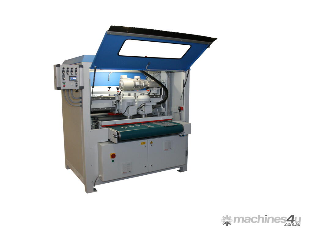 2 spindles driving abrasive discs, traverse the width of the feed through belt evenly removing the burrs before the next stage, again with 2 spindles traversing the feed through belt width produce a uniform 360deg rounded edge to all edges from all angles.