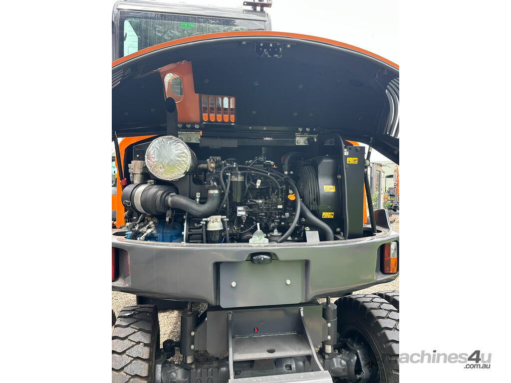Description: The DEVELON DX55WE is a versatile mini wheel excavator designed to excel in projects with limited space. Powered by a reliable Yanmar engine, this machine delivers up to 37.5 kW of net power, translating to superior digging and arm forces for its class. Its key advantage is mobility: the wheels allow quick road travel, while the robust undercarriage, which includes options for a dozer blade and outriggers, ensures excellent stability when digging and lifting on diverse terrain. With a bucket capacity of up to 0.19 m3 and a maximum digging reach of over 6.1 metres, the DX55WE is the ideal specialist for street development, ground maintenance, and utility installations.