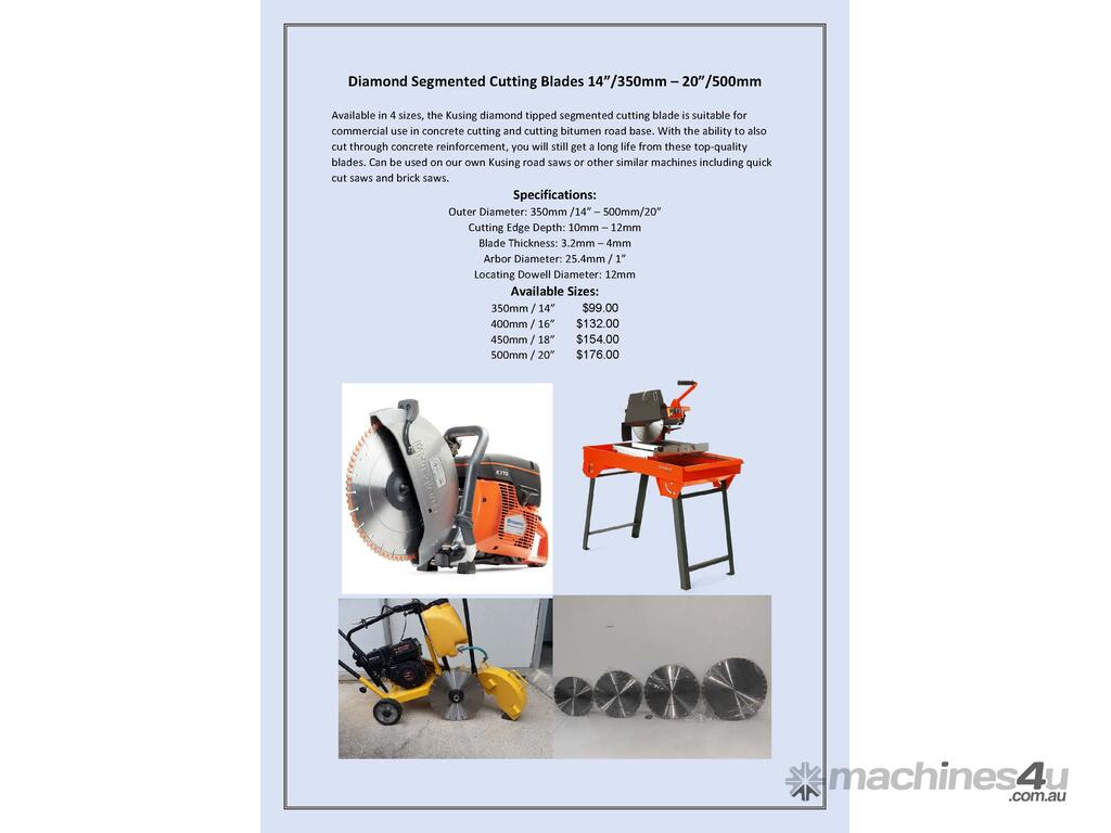 Available in 4 sizes, the Kusing diamond tipped segmented cutting blade is suitable for commercial use in concrete cutting and cutting bitumen road base. With the ability to also cut through concrete reinforcement, you will still get a long life from these top-quality blades. Can be used on our own Kusing road saws or other similar machines including quick cut saws and brick saws.