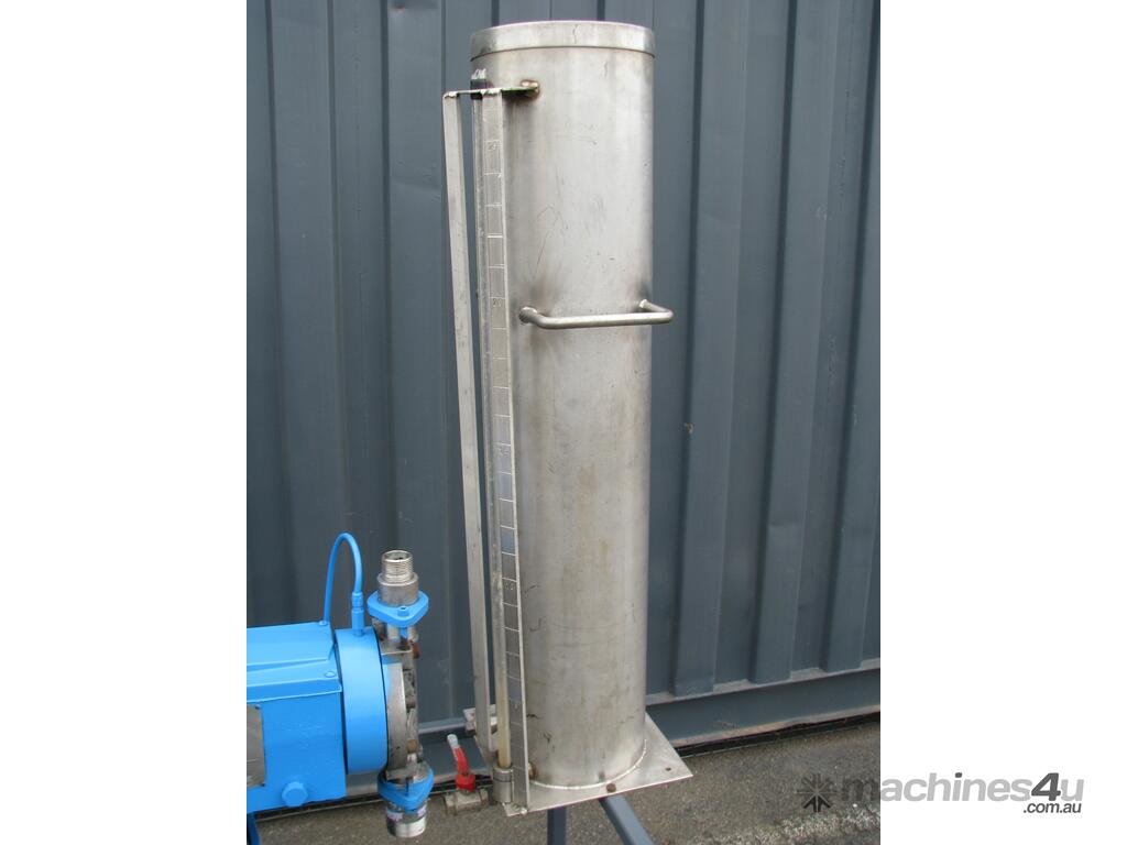 It is mounted on a wheeled frame with a 25L stainless tank.