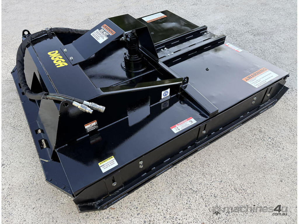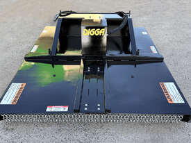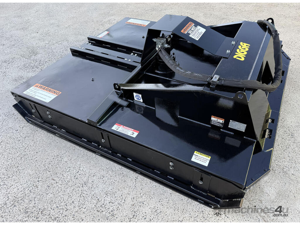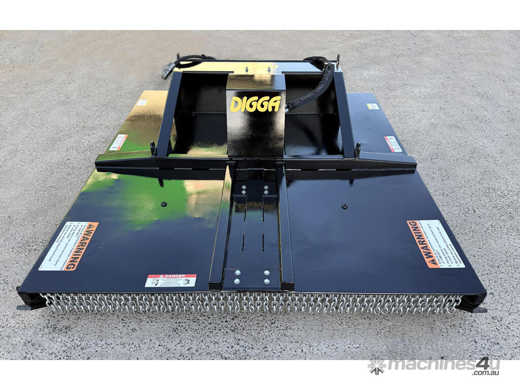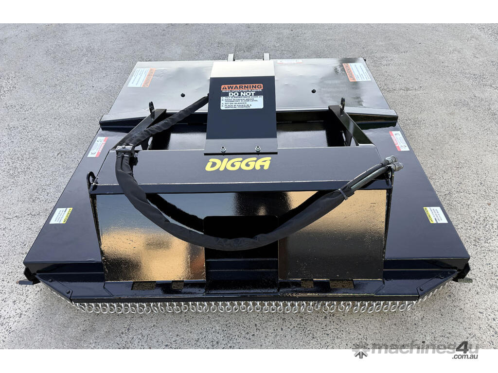 Digga 6ft slasher for skid steers – 1800mm cut (1930mm overall width) – excellent condition (renovated) – universal hitch – robust construction – heavy duty single cutting bar (new blades) – chain curtain for debris suppression – adjustable side skids (60mm x 16mm steel bottom skid plate) – flat-face couplers – hydraulic flow 30-70 lpm – weight 461kg – designed and manufactured in Australia (2023).