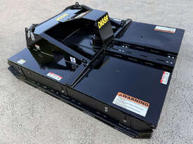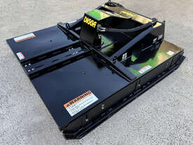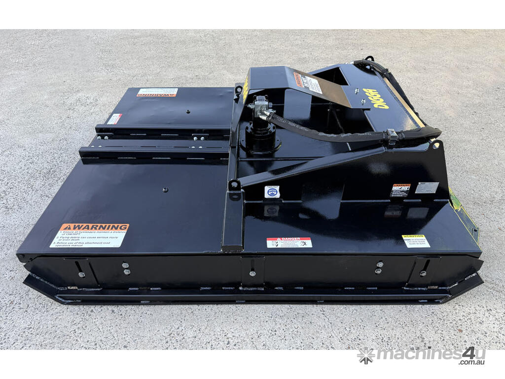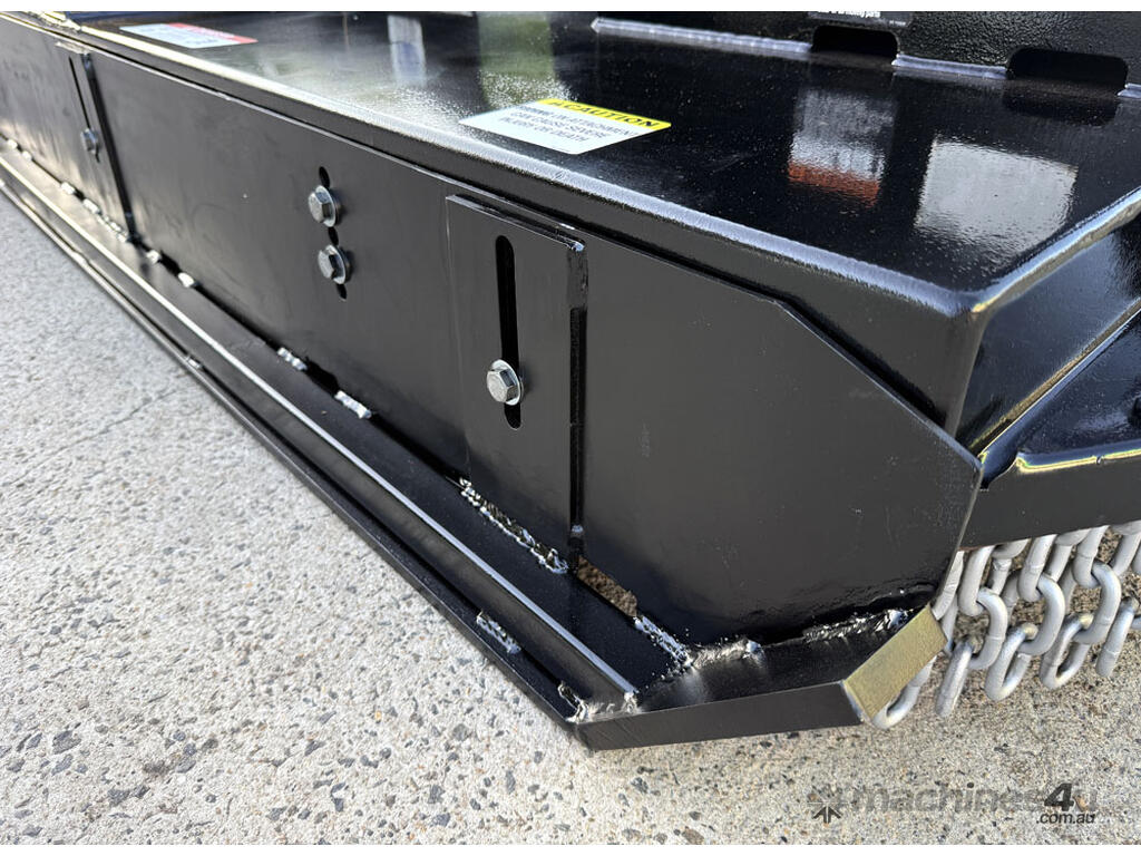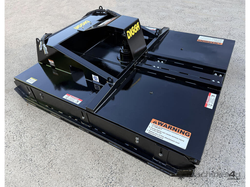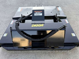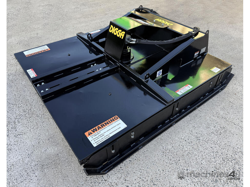 Digga 6ft slasher for skid steers – 1800mm cut (1930mm overall width) – excellent condition (renovated) – universal hitch – robust construction – heavy duty single cutting bar (new blades) – chain curtain for debris suppression – adjustable side skids (60mm x 16mm steel bottom skid plate) – flat-face couplers – hydraulic flow 30-70 lpm – weight 461kg – designed and manufactured in Australia (2023).