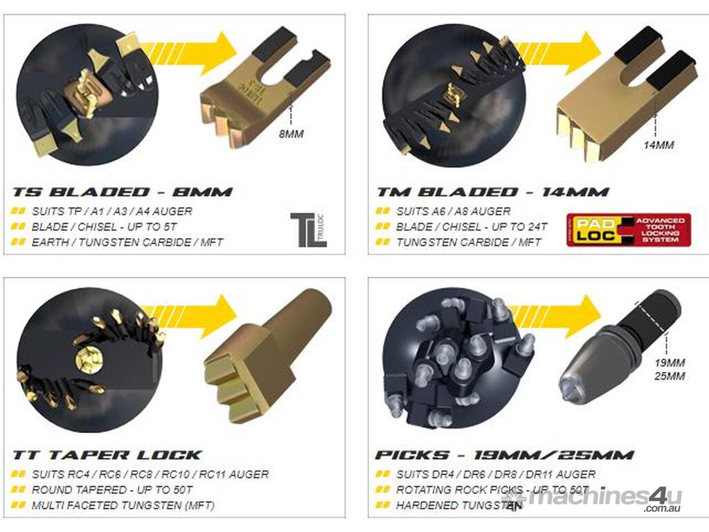 Our auger wearparts are specially designed to help your auger perform at its best. Our range of auger teeth offers three finishes; standard, flat tungsten, and multi-faced tungsten for tougher ground conditions. Refer below for the wearpart which best suits your auger and ground drilling needs. You can choose between a bladed cutting head, a tapered cutting head, or a rotating rock pick design.
