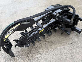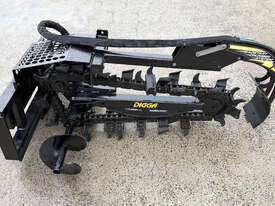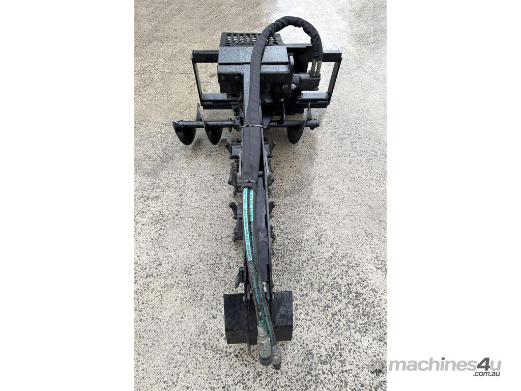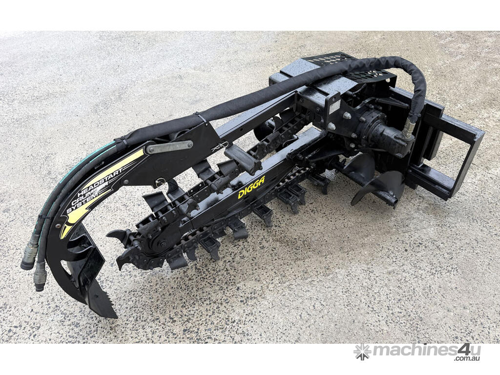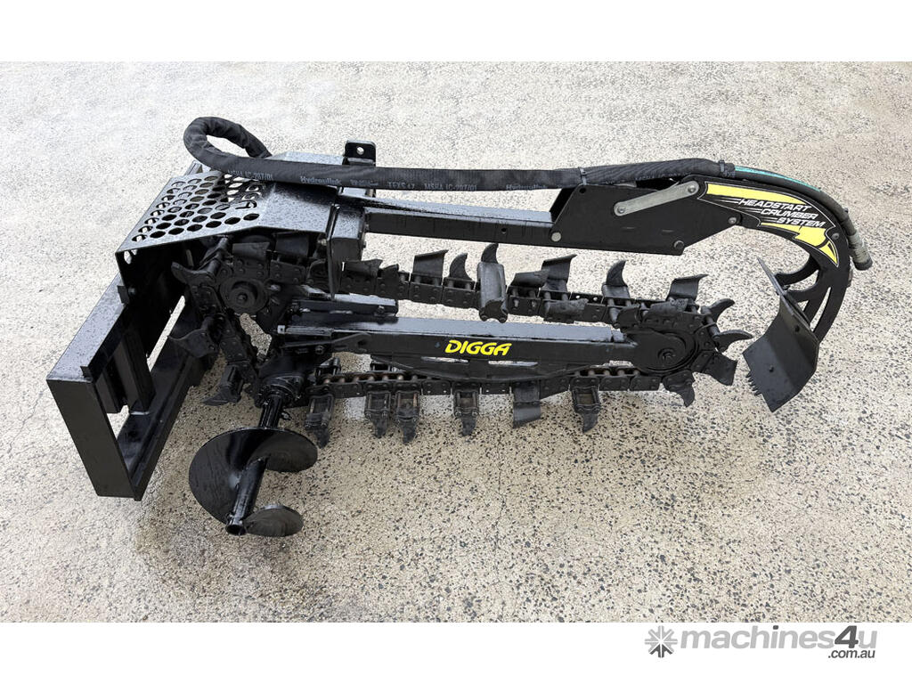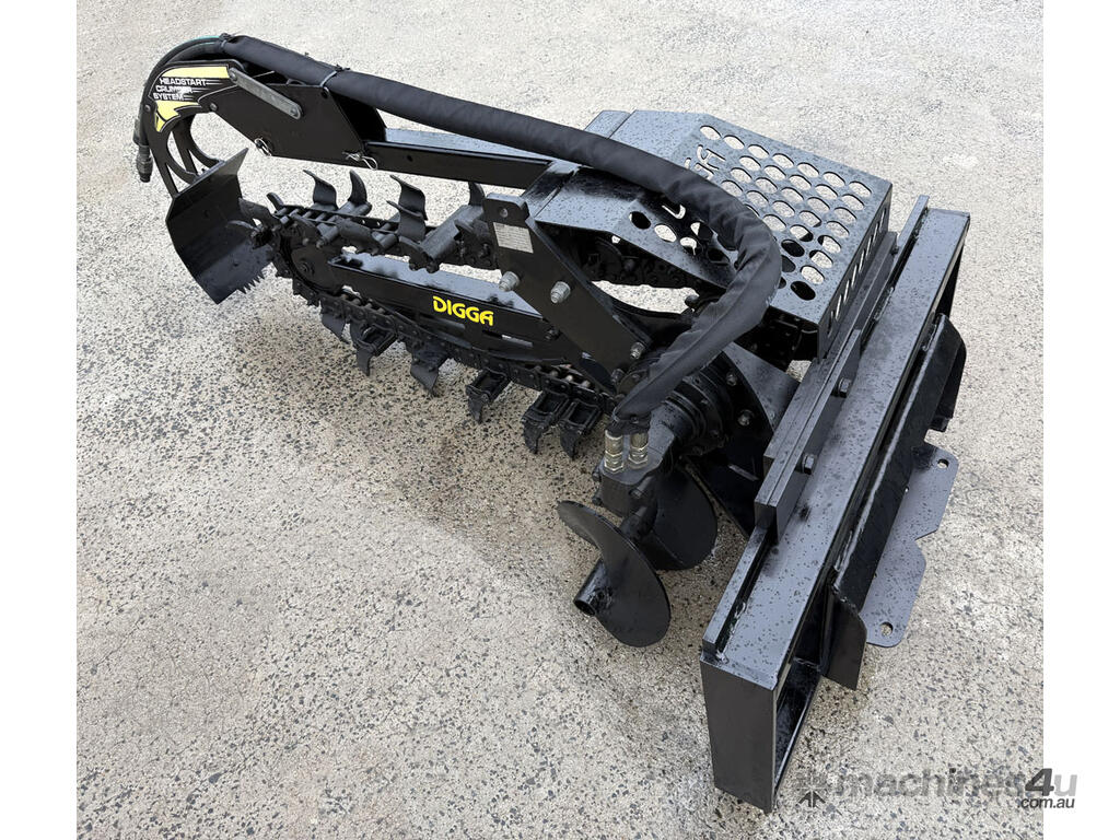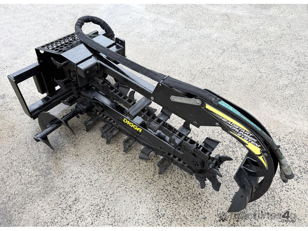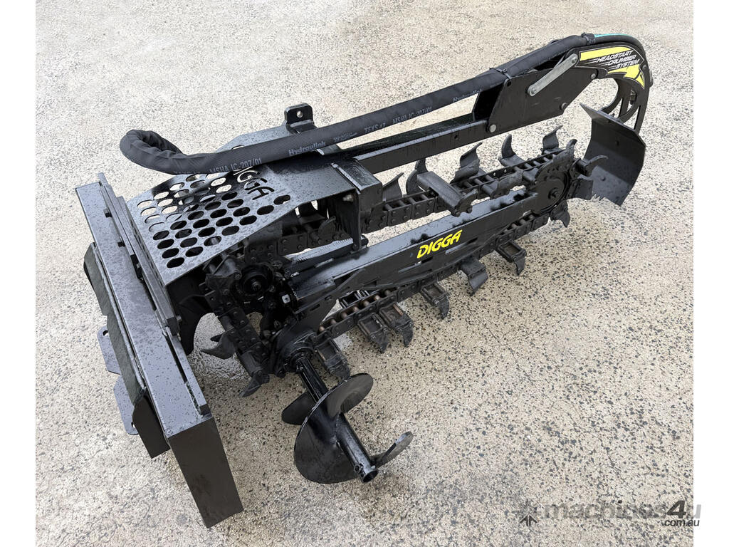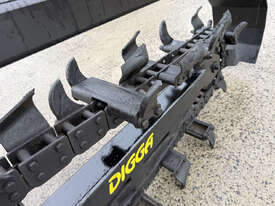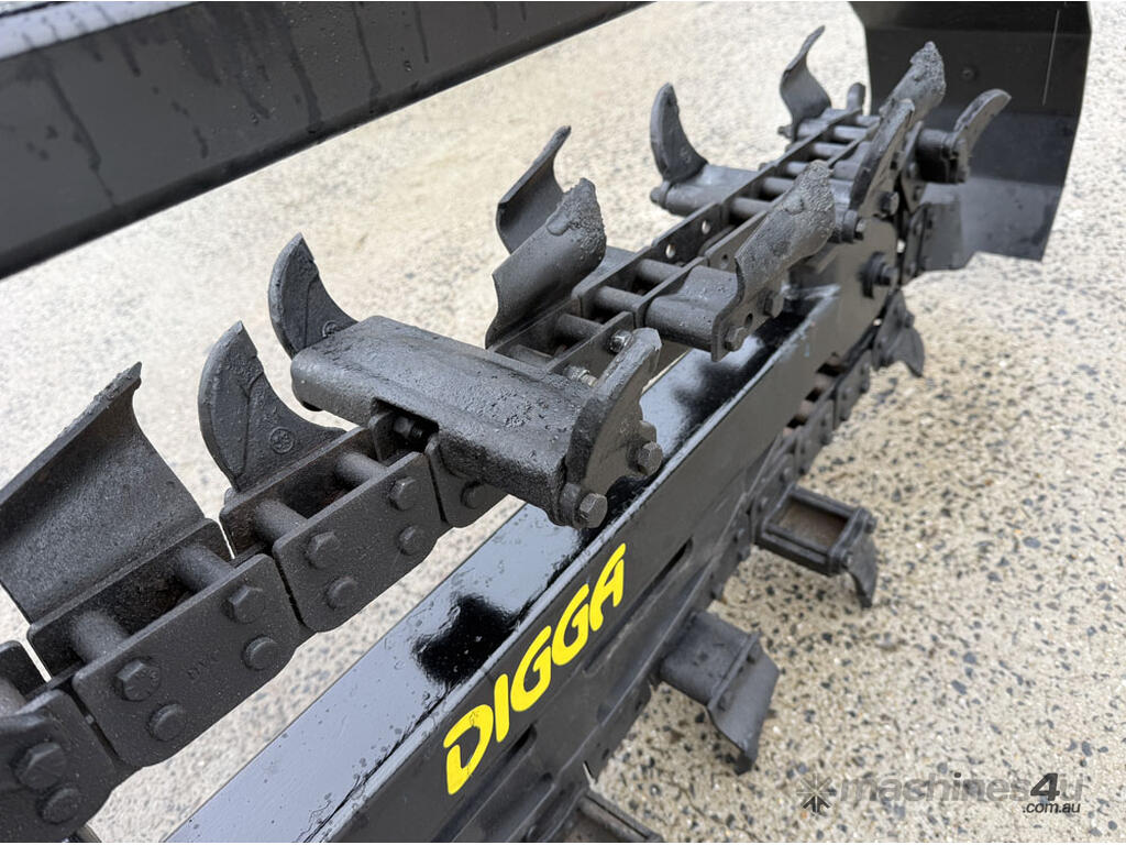 Digga Hi-drive trencher for mini skid steers – 900mm long bar – excellent condition (new) – supplied with crumber bar – flat-face couplers (swap to poppet couplers on request). Combination chain currently set to 300mm wide (can be reset to 150mm wide if required).