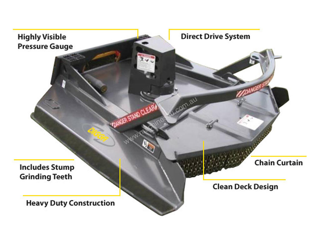 Digga’s heavy duty 72” Rotary Axe is the ultimate attachment for clearing & shredding thick bush & scrub. Working in conjunction with the heavy duty push bar, the front hood opens up exposing the ¾” blades past the guards, enabling close up axe-like cuts to remove trees up to 7” (180mm) in diameter.