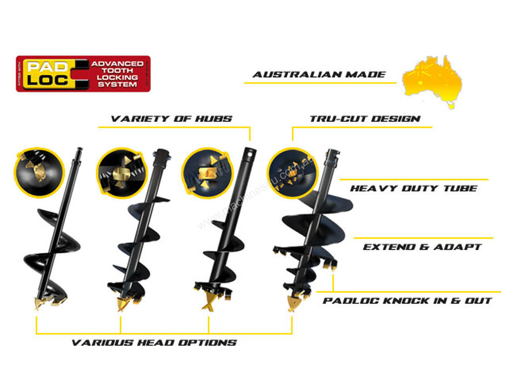 The A3 is constructed for efficient post hole digging while the A4 is the Contractor’s choice able to drill holes in earth and clay and designed specifically for the tough Australian conditions. Available in Earth, Tungsten, or MFT for general drilling. Easy PADLOC knock in and out teeth require no special tools.