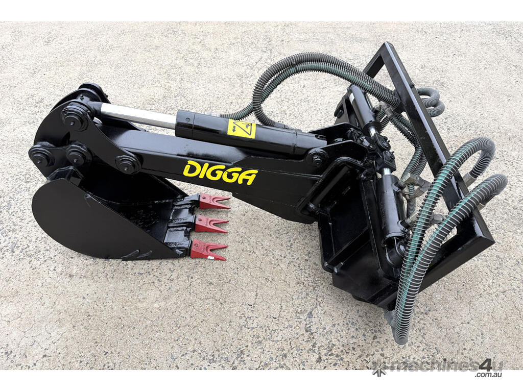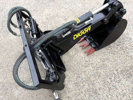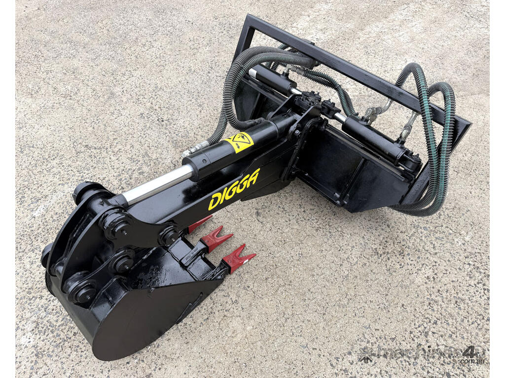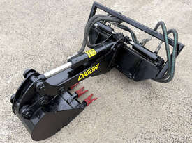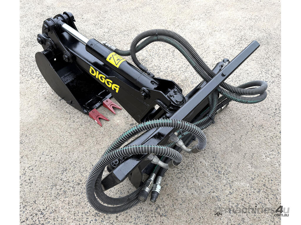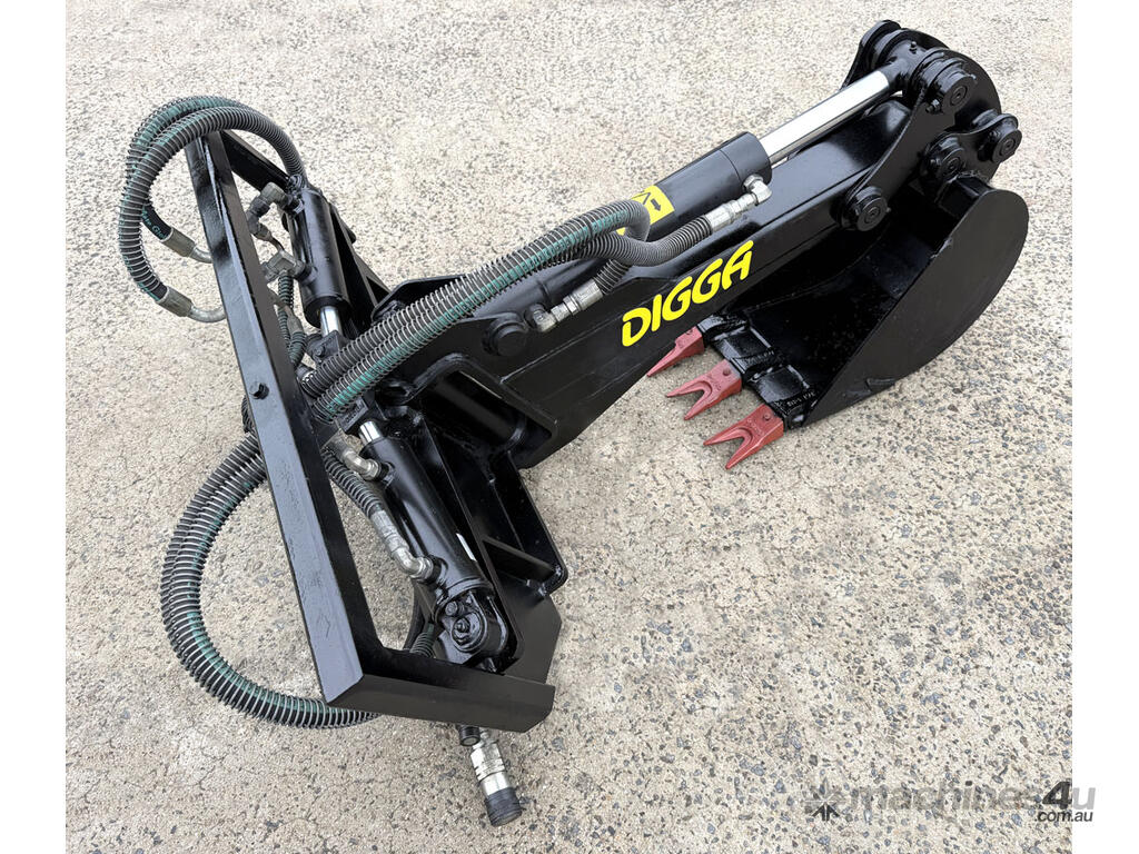 Digga pivoting front hoe for mini skid steers – excellent condition (new) – robust design – flat-face couplers (swap to poppet couplers on request) – bucket has tiger teeth for better breakage of hardened soil – bucket width 300mm.