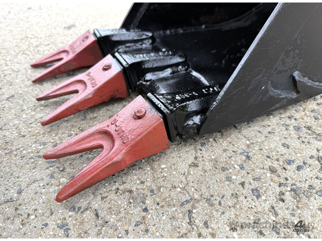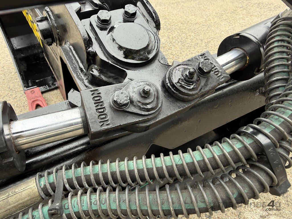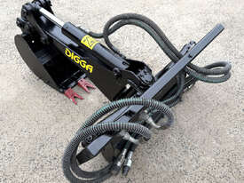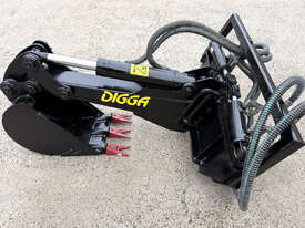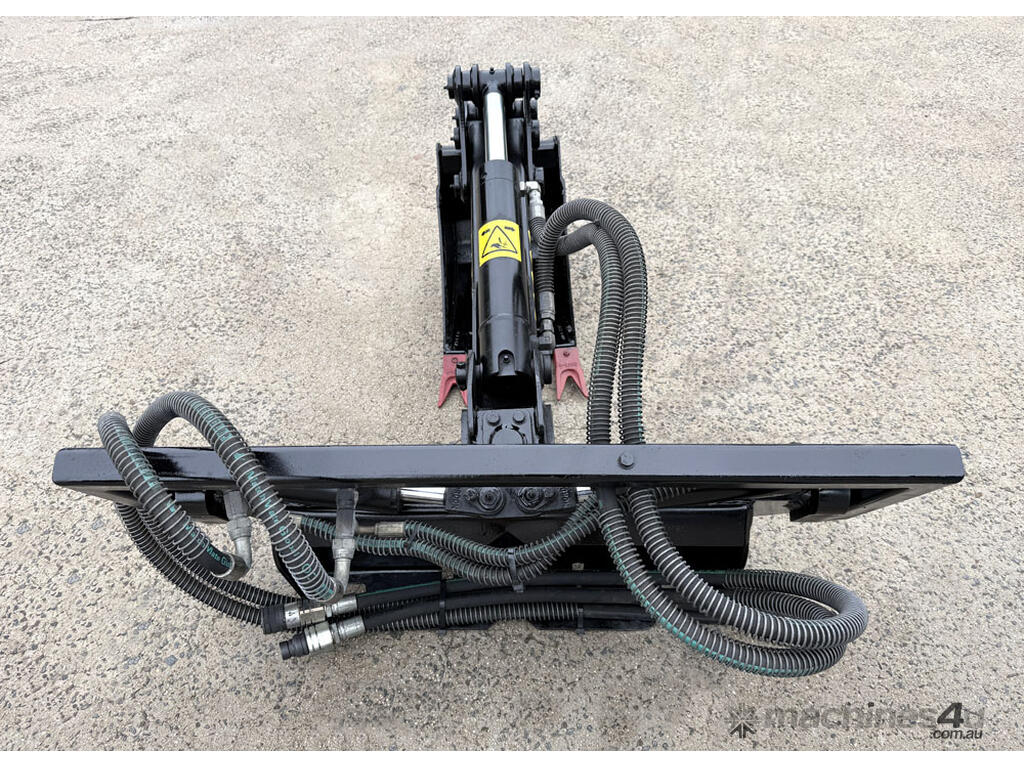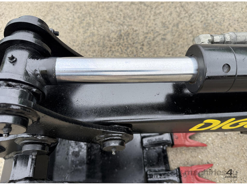 Digga pivoting front hoe for mini skid steers – excellent condition (new) – robust design – flat-face couplers (swap to poppet couplers on request) – bucket has tiger teeth for better breakage of hardened soil – bucket width 300mm.