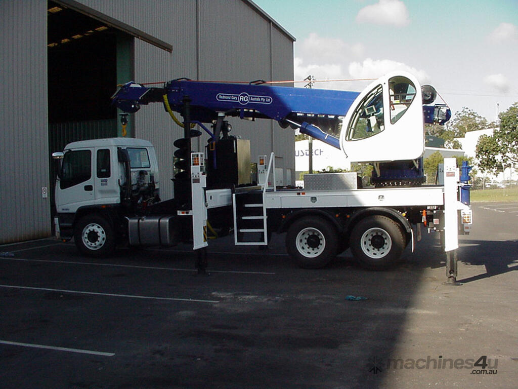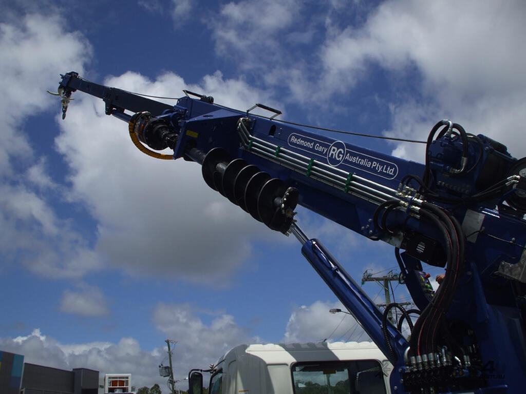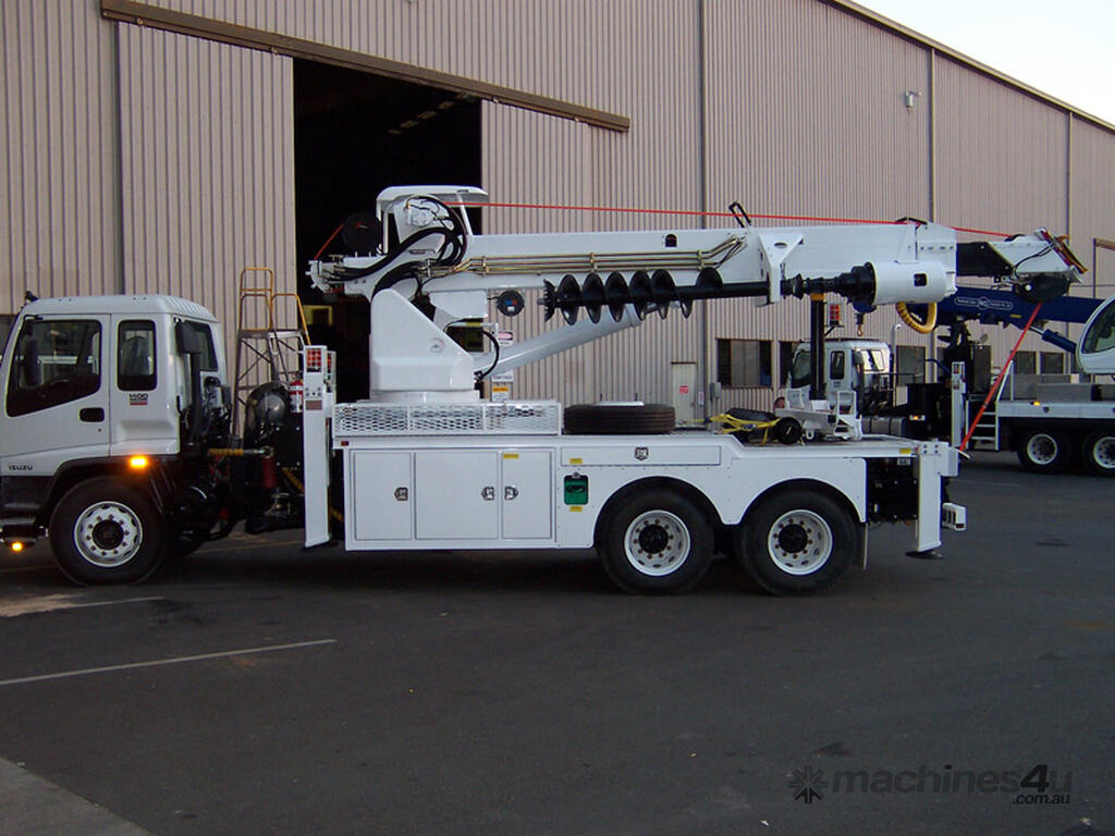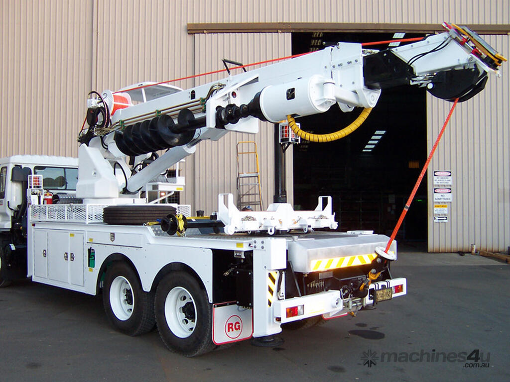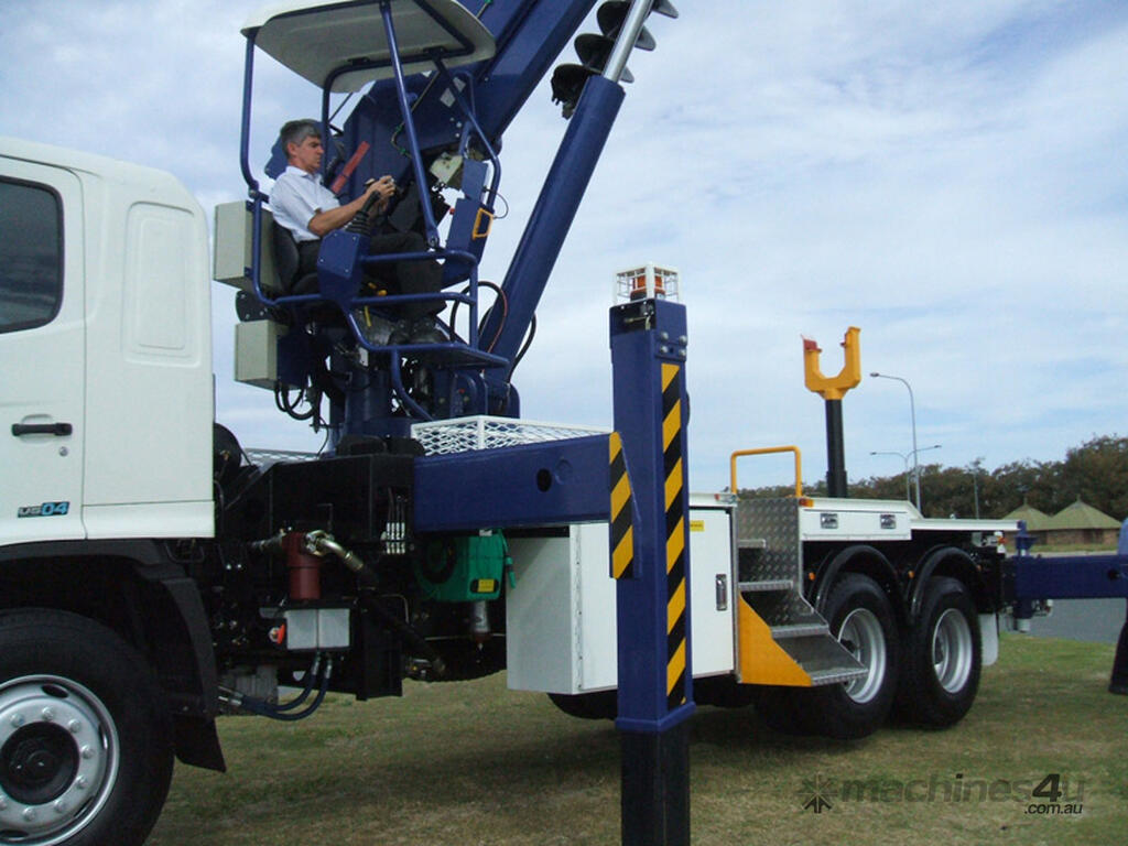 The PoleERU was originally designed in 2001. After 14 units were manufactured, the PoleERU was subject to re-design based on market feedback. The current model was re-released to the market in 2008. The PoleERU has been completely designed using 3D engineering design tools and finite element analysis utilizing the latest materials and best practices. This simple but rugged design is specific to the Australian market and takes into consideration that many machines are located in remote areas and must be easy to maintain. The machine features a high strength boom with superior lifting height capabilities. The PoleERU is equipped with radial piston motor-driven epicyclic gearbox which has speed range from 0-63 rpm and has maximum torque output of 18,600 Nm. The machines are offered in pilot operated joystick type control or radio remote and can be offered on special request in 6-tonne /10-tonne version. Some of the specific design features are as follows: