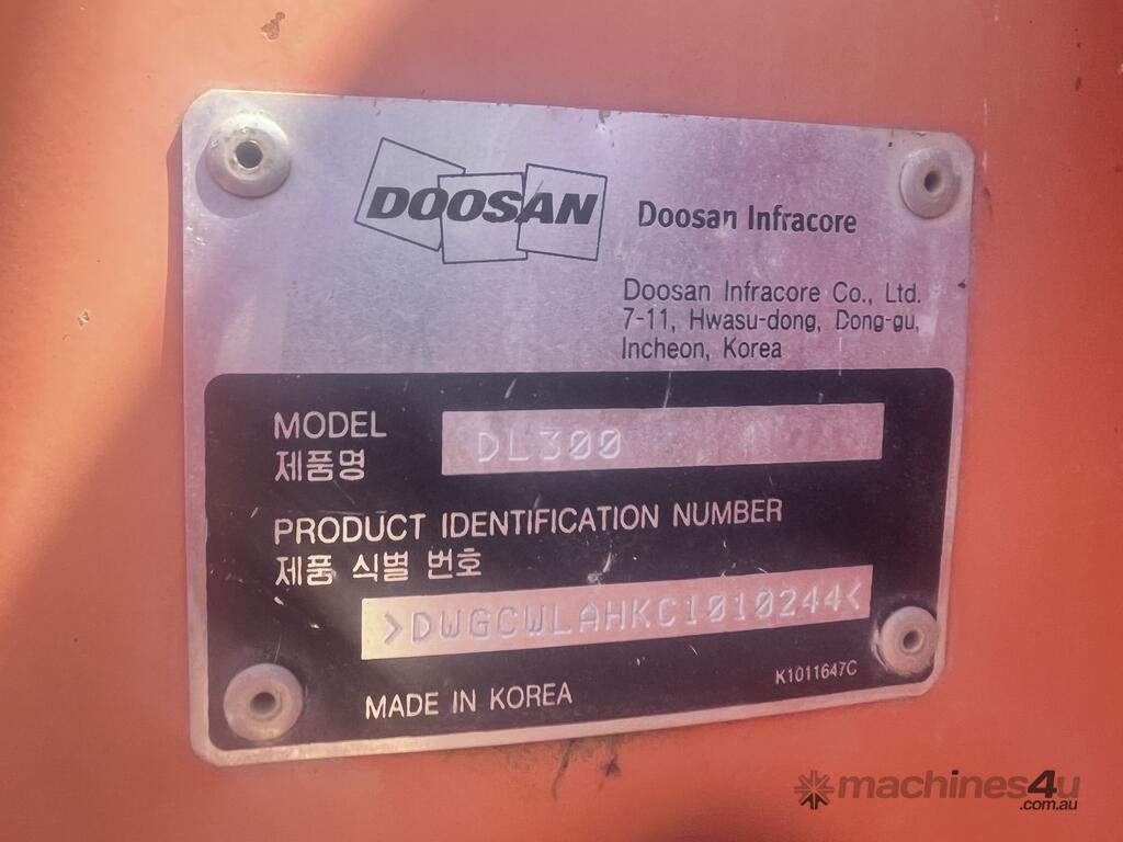 No C/P,Doosan,DL300,Articulated Front End Loader,6 Cyl,Diesel,Odometer not visible,8791 (Hrs. Showing on Hour meter),Colour: Orange,Unregistered,VIN: DWGCWLAHKC1010244,Serial No: 10244,Sold with No Plates