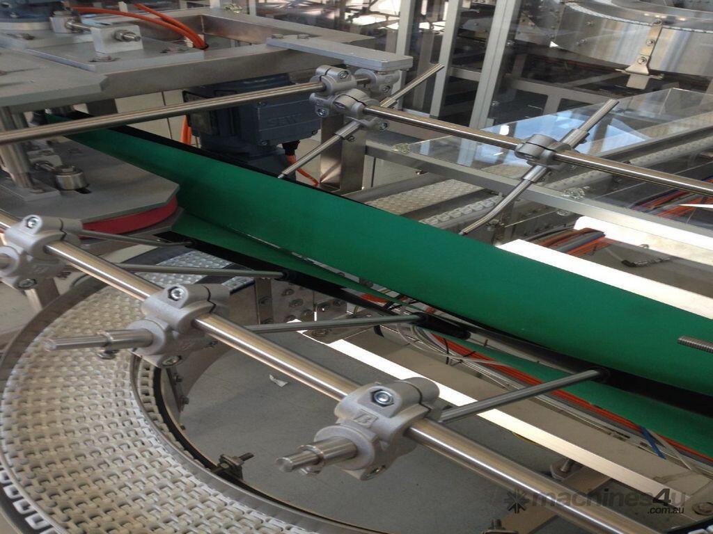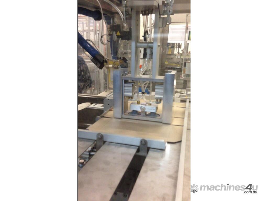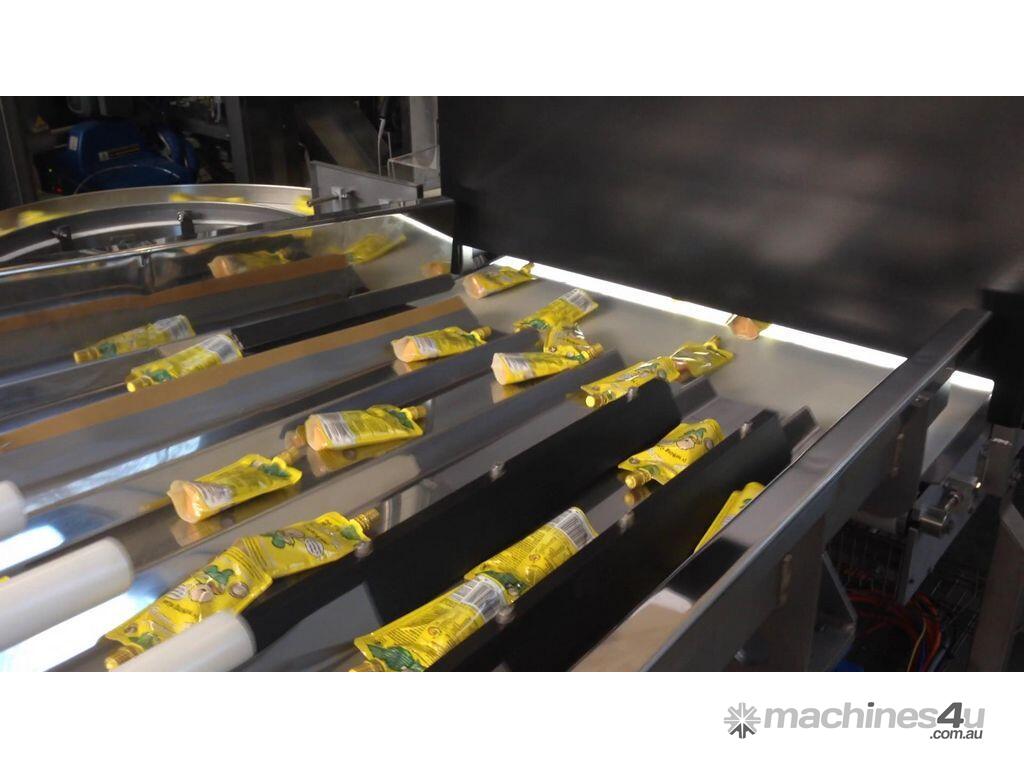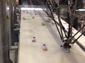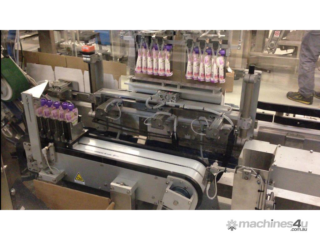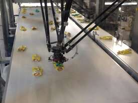 Doy Pack or Pouch Handling and Packing System, "Mespic", integrated spider robot cell to orientate the product with; capacity up to 200 pouches per minute, Omron vision system, 3 x Codian spider robot picking heads with suction cups, 21" touch screen display fitted on the machine frame, rejects deformed pouches and orientates good pouches. 2 x case erectors, pick and place case packers and case sealers each with; capacity up to 100 pouches per minute each, HMI 21" touch screen display, Nordson gluing system. Also included: 2 x pouch twister conveyors, standing up and laying down pouches, large width infeed conveyor, vibratory feed for sorting pouches into 2 lanes, pouch diverter for evening load into the 2 cartoners, pouch rotator/orientator (rotates pouches face up), 2 x carton sealers, various Intralox conveyors and belt conveyors throughout the system