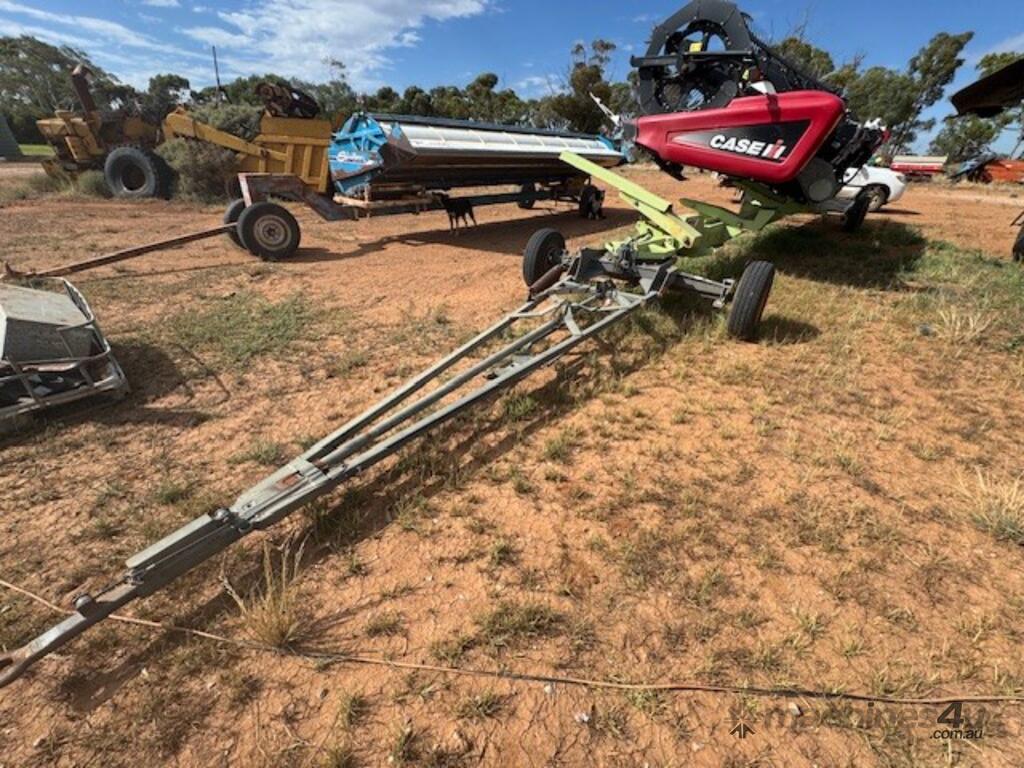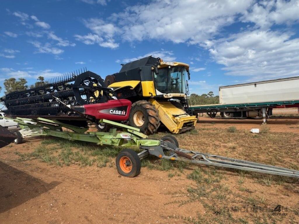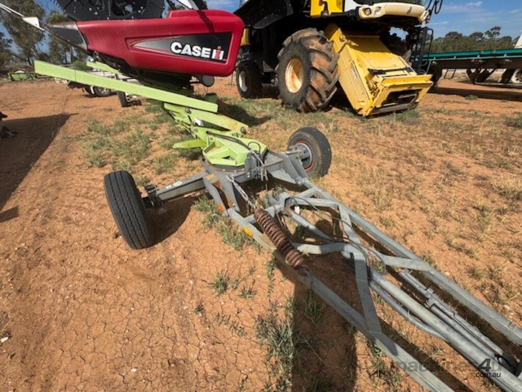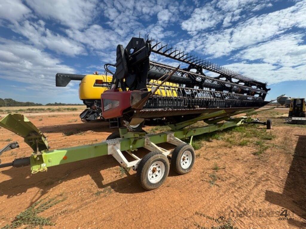 Case 2152, 25', DOM: 2011, Model no: 215225M092VC, Serial no: YBZND7741, adaptor to suit New Holland, adaptor model no: G156915, plastic tyne reel, share draper belt, on CLAAS 3 axle dolly trailer, DOB 211, Model no: 519, Serial no: 51900714.