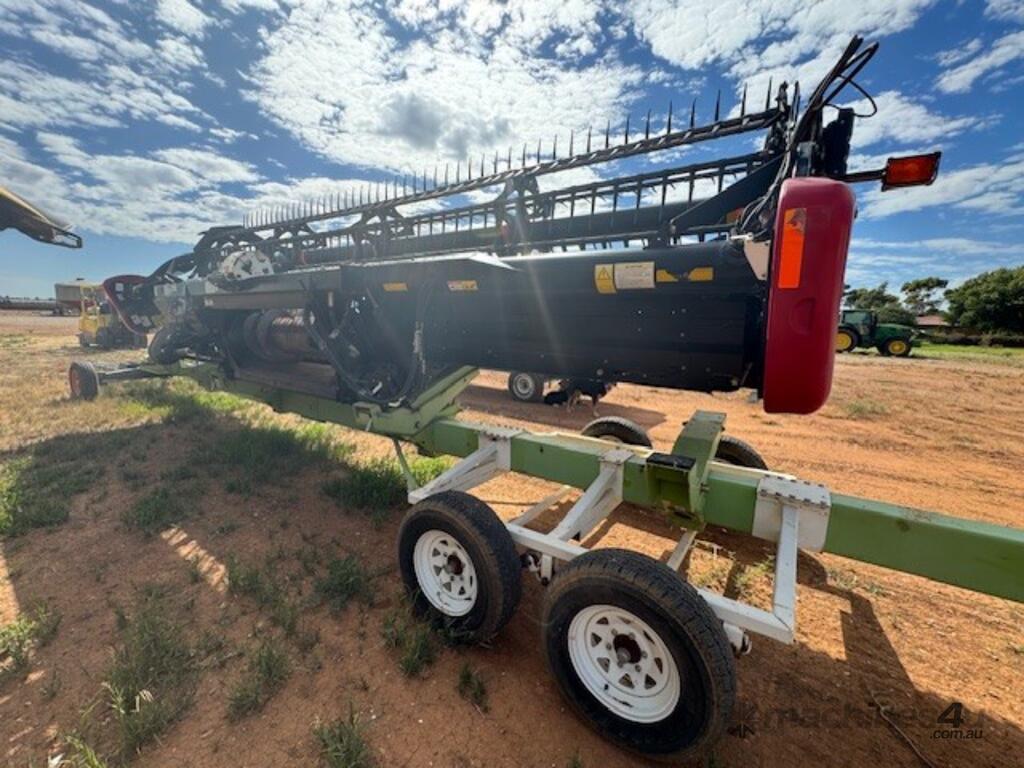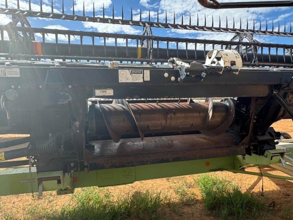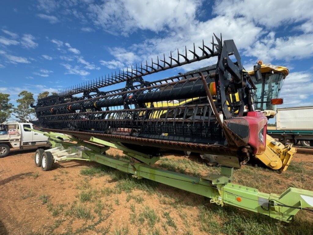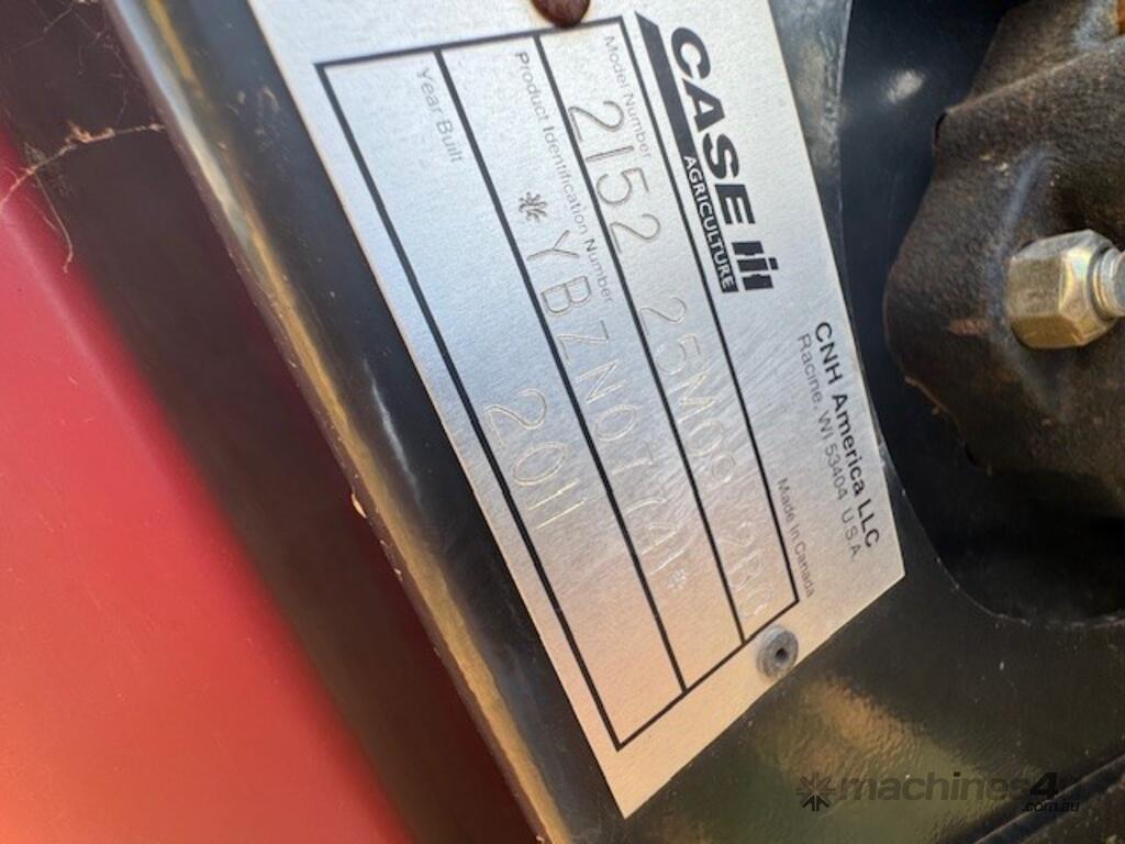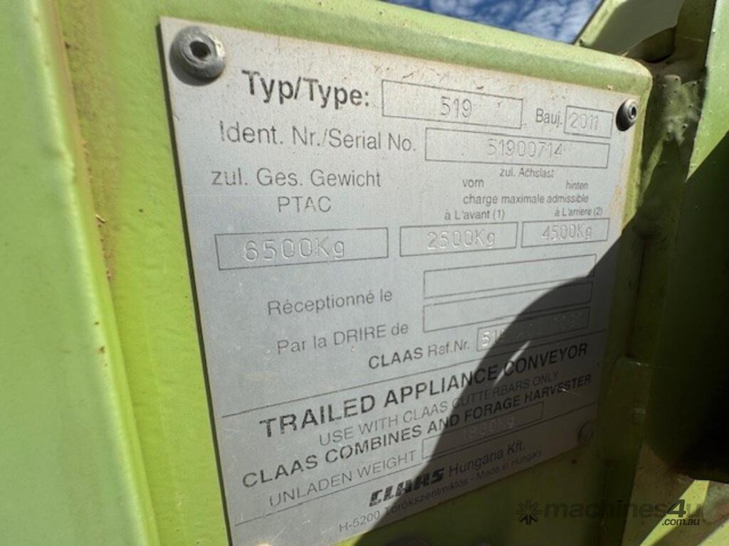 Case 2152, 25', DOM: 2011, Model no: 215225M092VC, Serial no: YBZND7741, adaptor to suit New Holland, adaptor model no: G156915, plastic tyne reel, share draper belt, on CLAAS 3 axle dolly trailer, DOB 211, Model no: 519, Serial no: 51900714.