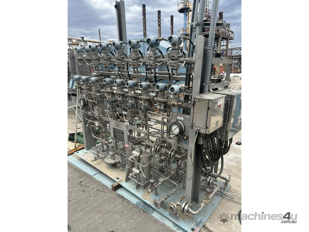 High quality OEM instrumentation skid assembly, fitted with extensive stainless steel tubing, multiple pressure transmitters, valves, manifolds, filters, gauges and hazardous area rated electrical enclosures.