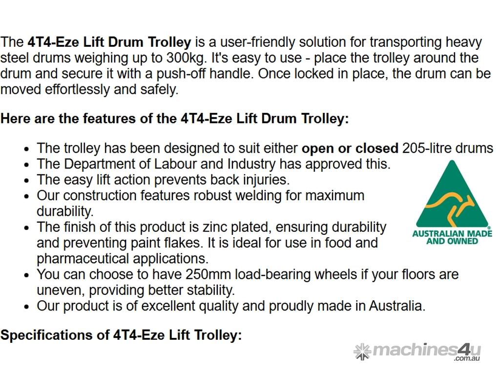 The 4T4-Eze Lift Drum Trolley is a user-friendly solution for transporting heavy steel drums weighing up to 300kg. It's easy to use - place the trolley around the drum and secure it with a push-off handle. Once locked in place, the drum can be moved effortlessly and safely.