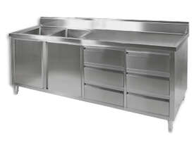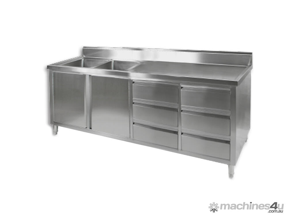 Great for open kitchens Two Left Sinks 2400 mm wide ALL STAINLESS STEEL KITCHEN TIDY CABINET WITH SINK, DOORS & DRAWERS • 700 mm deep × 900 mm high + 150 mm splashback • "Punched" bowls • Bowl size 450mmW×450D×300H • 90 mm Ø drain hole • pre-assembled with all welded joins • Top & Frame: 1.2 mm; SUS304 grade (18/8); Hairline finish • Doors & drawers are 0.9 mm ALL STAINLESS STEEL CABINETS WITH SINK & HANDY DOORS & DRAWERS TO KEEP KITCHENS TIDY AND HIDE CLUTTER 2 Years Parts only Warranty Depth: 700 mm | Width: 2400 mm | Height: 1050 mm | Price: $2950 | Manufacturer: Modular Systems