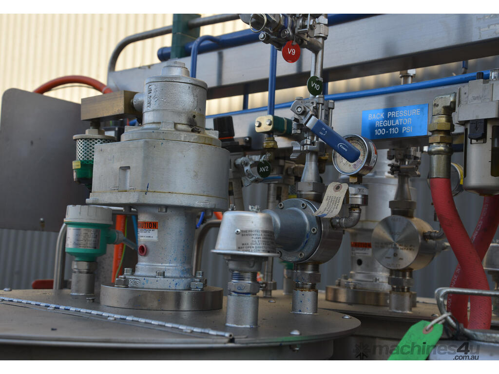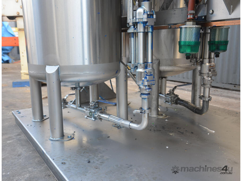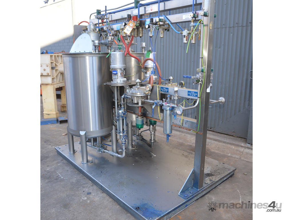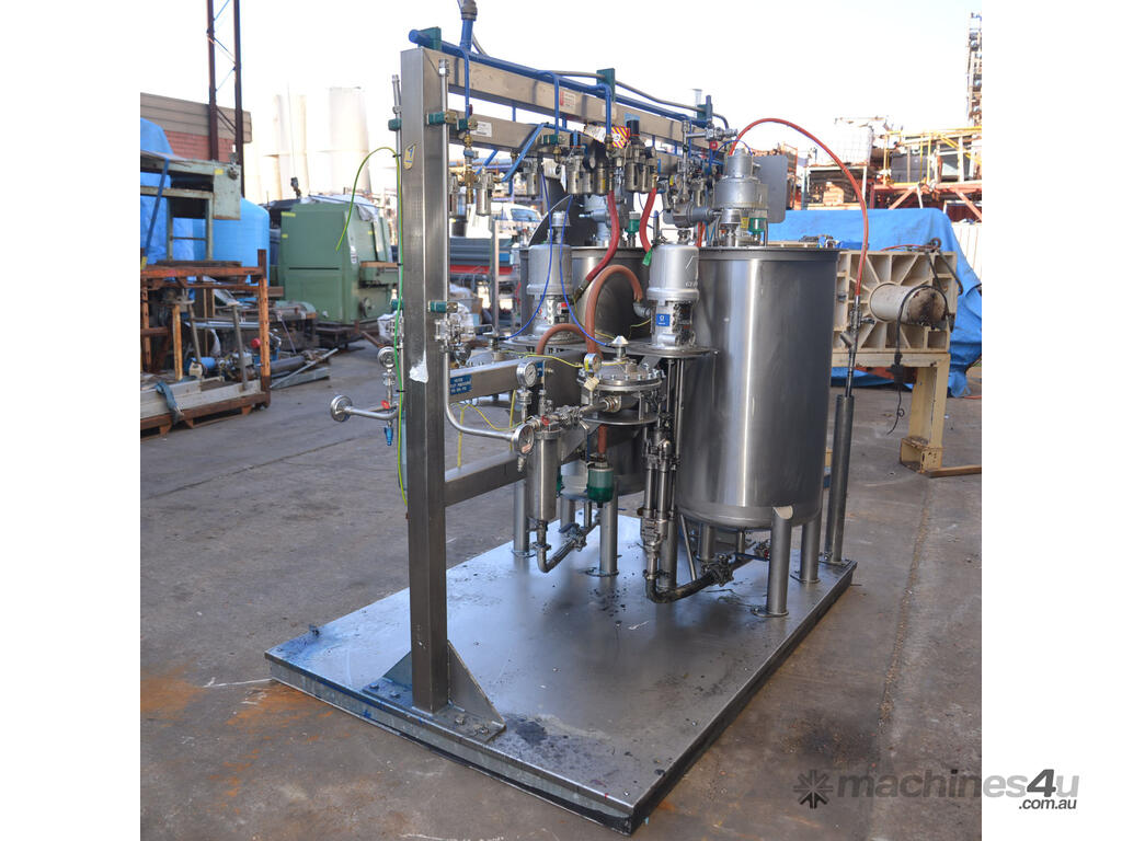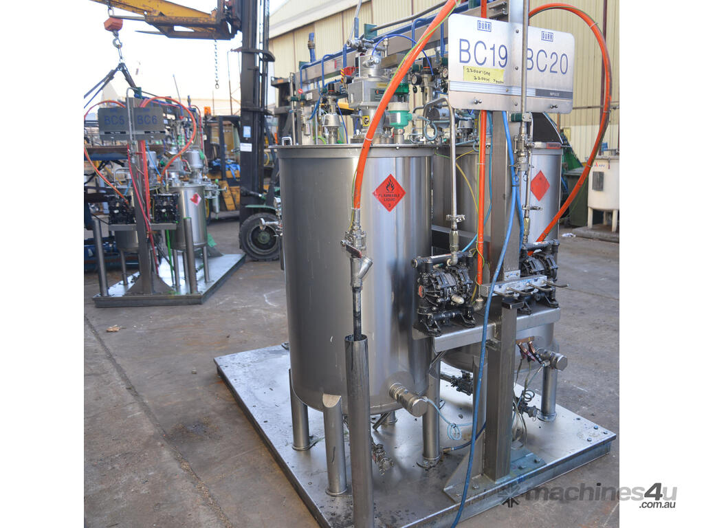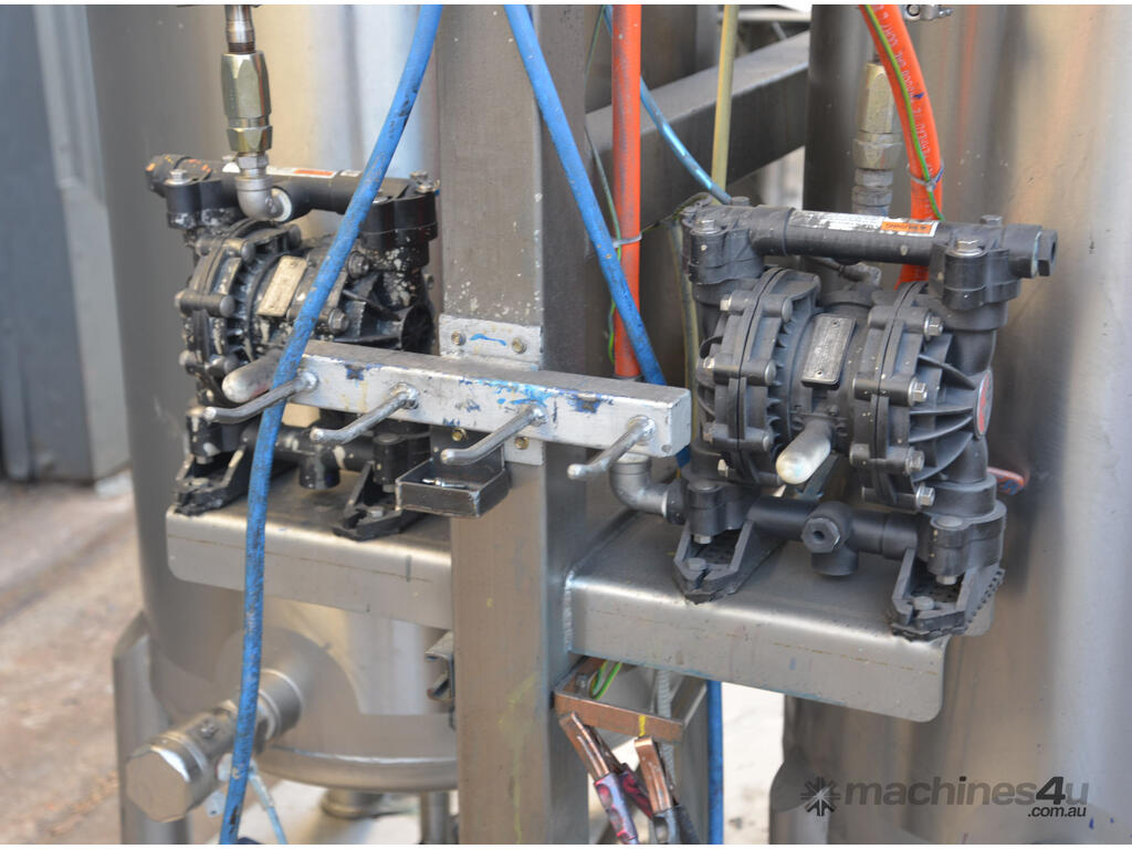 Dual 315L Stainless Steel paint mix mixing vessels with pneumatically driven agitator agitated paint mixing kitchen pump station mix tank skid