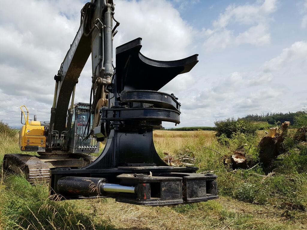 The DYMAX Excavator/Skid Loader GRAPPLE TREE SHEAR is the perfect tool for forest utility work, hazardous fuel removal from forest lands, plantation thinning of acacia and eucalyptus, biomass fuels production and trimming limbs and trees for roadside maintenance and site development or alongside railroad tracks.