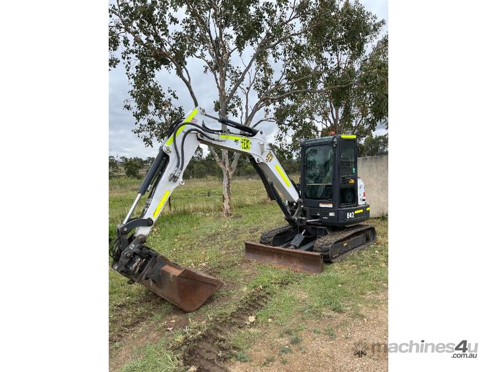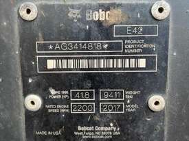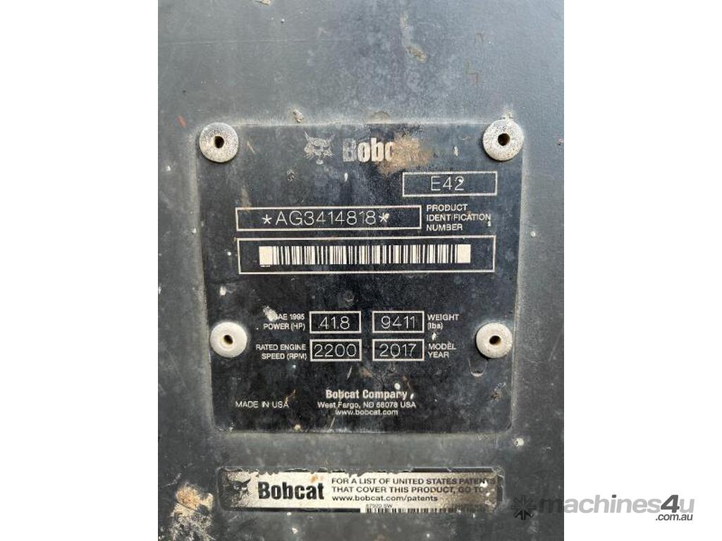 E42 BOBCAT EXCAVATOR 2017 model, 2721 hours. Rubber tracks/hydraulic quick hitch/hydraulic grabs/1200mm mud bucket/600mm bucket/400mm bucket/ripper.