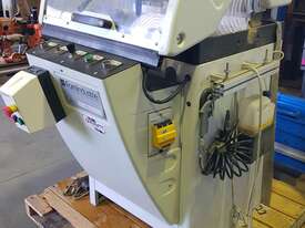 6). OMGA AL 260 DOUBLE 45deg MITRE SAW Plus 4m Infeed Roller Table / Flipover Stop, Pneumatic Vertical/Horizontal Clamping, Semi-Automatic Operation, Digital Sizing, Made in ITALY, Very Heavy Duty Cast Iron Bed. Top Condition.