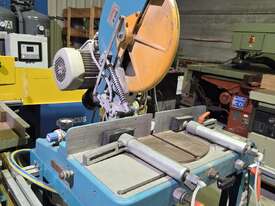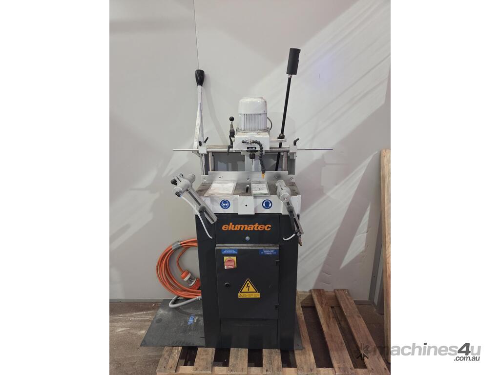 11). ELUMATEC ALUMINIUM MITRE SAW MODEL MGS 72/30, 3000W 415v, Year 12/2006, 2 x HORIZONTAL AIR CLAMPS, 3m INFEED / 4.5m OUTFEED HEAVY DUTY ROLLER TABLES / STANDS / ALUMINIUM FENCE / FLIPOVER STOPS, MADE IN GERMANY. GOOD ORIGINAL CONDITION. HUGE PRICE REDUCTION!