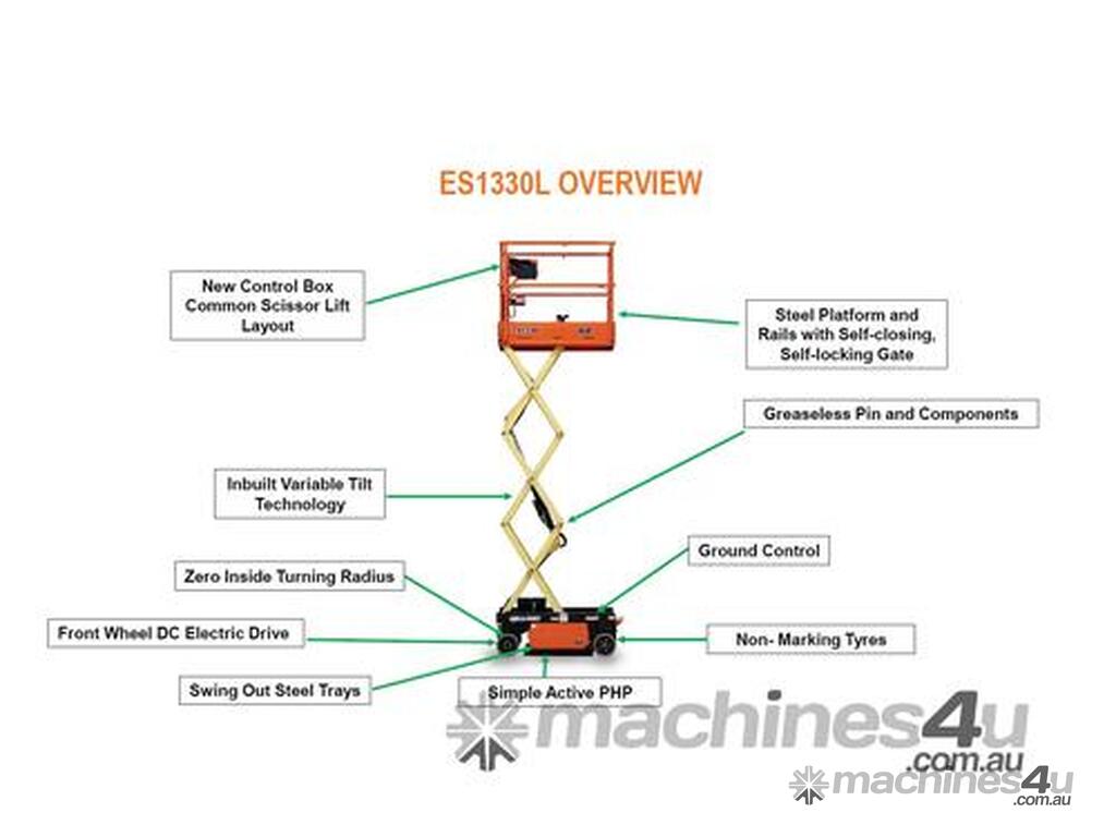 The new JLG ES1330L is a compact scissor lift with a zero inside turning radius designed for use in space constrained work areas. The light gross vehicle weight also allows it to drive into passenger elevators and be used on weight sensitive flooring.