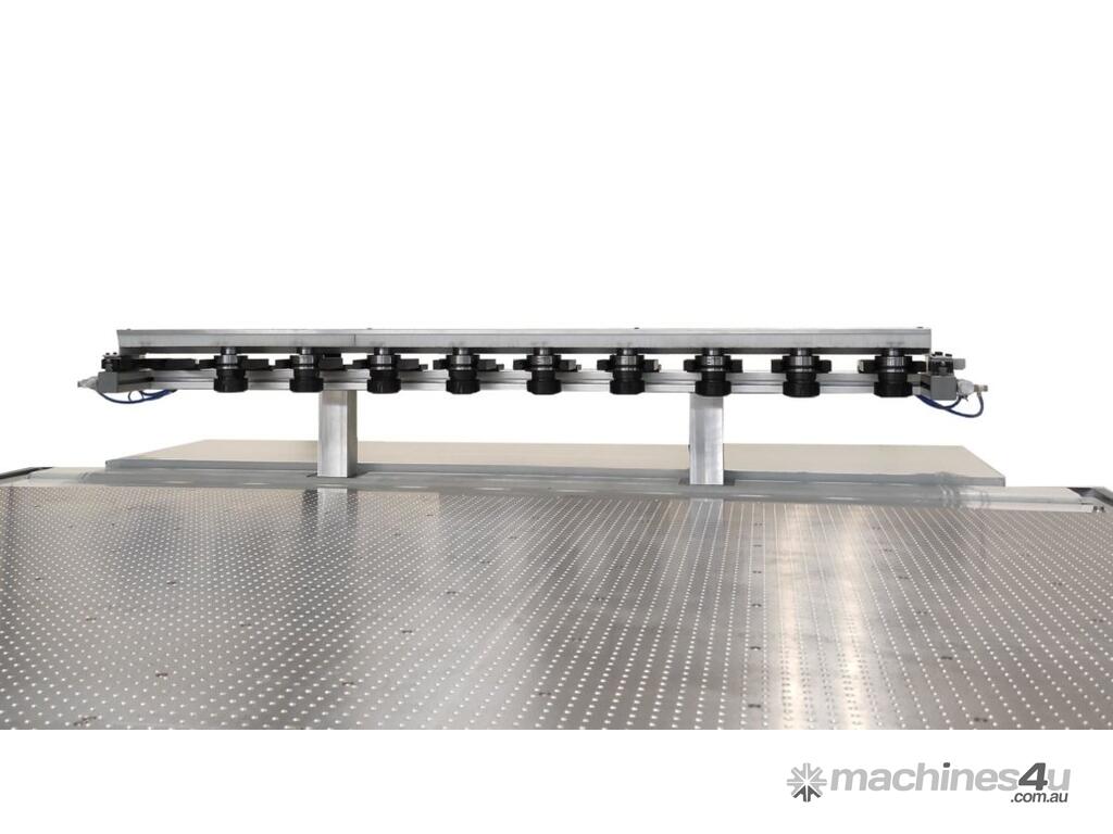 Workpiece vacuum clamping: phenolic resin grid table with 8 automatic and independent vacuum zones (configurable from the control panel and even from the machining program), and incorporates threaded metal inserts for clamping workpieces and tools. Also available with micro-perforated aluminum table.