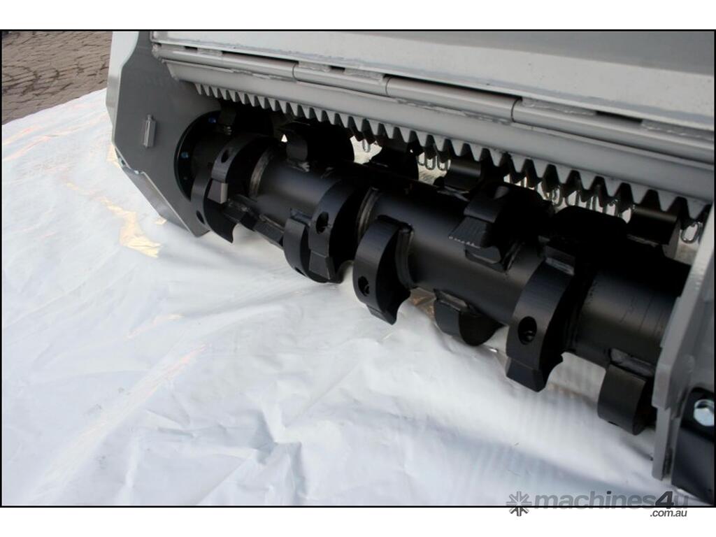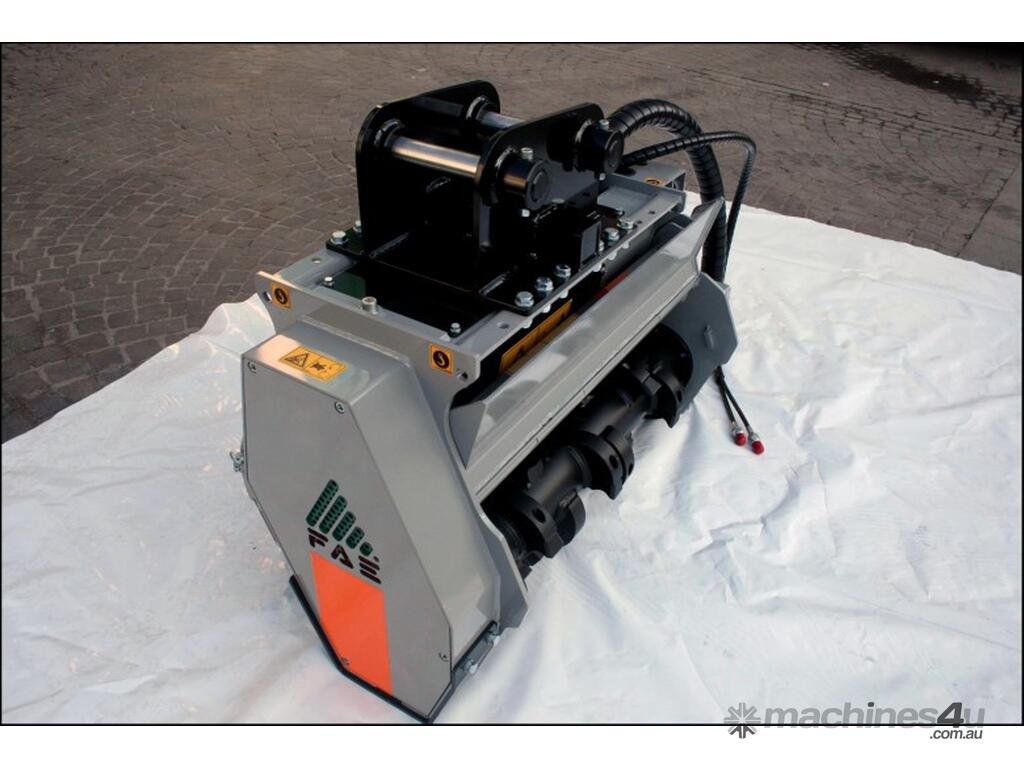 DML/HY (1 and 1.25 m cut) 5 T to 14T Excavator Fixed Hammer Mulcher with hydraulic variable displacement 32/65 cc piston motor, extension shaft with double roller bearing, HP transmission. Patented FAE hammer design with protected bolt inside holder and re-usable blades inserts. Hardox breaker bars and wear plates. Wear protection for pulley case. Anticavitation and check valve block with 2 relief valves. Diverter valve kit for hydraulic doors with control box in operator's cabin.