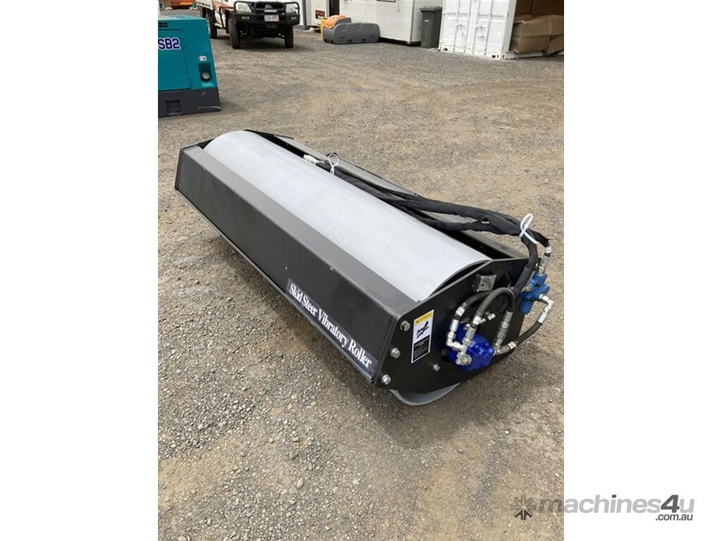 EXEQ VIBRATORY SKID STEER ROLLER ATTACHMENT. VIBRATION FREQUENCY: 2600Vpm, VIBRATION FORCE: 3880KGS, DRUM DIAMETER: 600mm, DRUM WIDTH: 1855mm, APPROX. SHIPPING DIMENSIONS: 2150mm L x 950mm W x 630mm H. APPROX. WEIGHT: 860KGS.