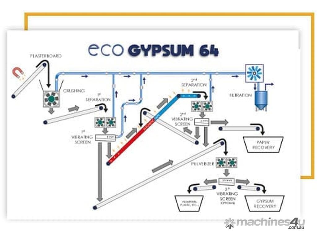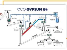 The recovered gypsum powder i s of high quality, 97,6% pure, practically free of paper and reusable in new production cycles.