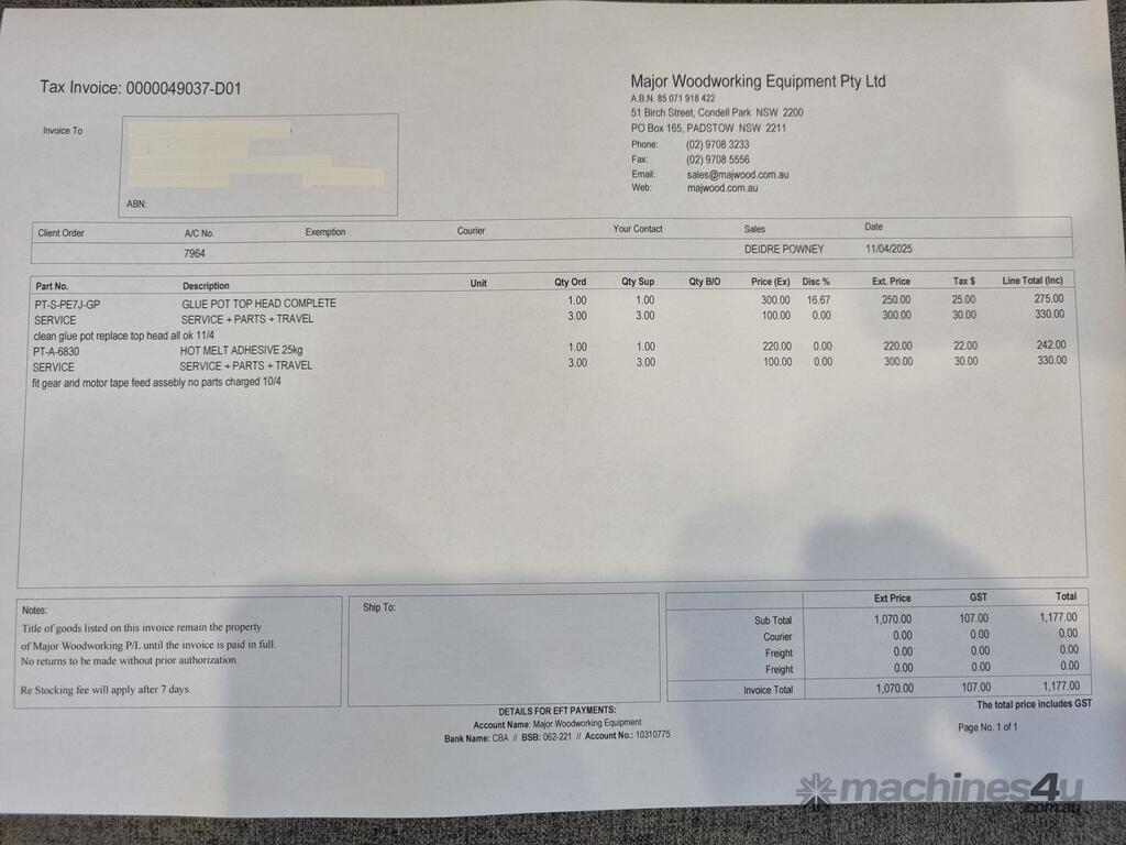 Machine was sold new and has been serviced by Major Woodworking Australia Equipment the dealer based in Sydney