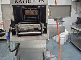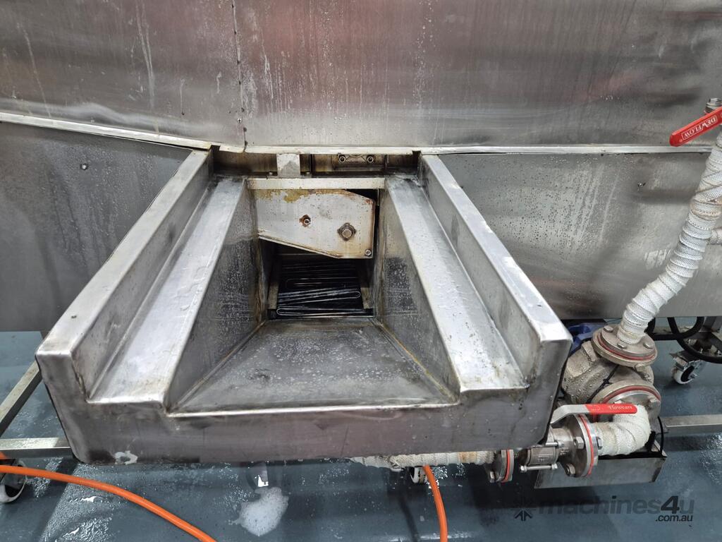 • 3 conveyor belts. 1) to load the product, 2) top conveyor belt with flaps to push the product forward, 3) exit and drain off conveyor belt