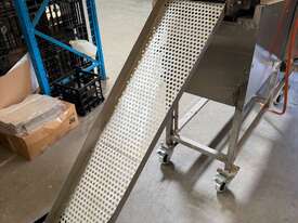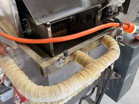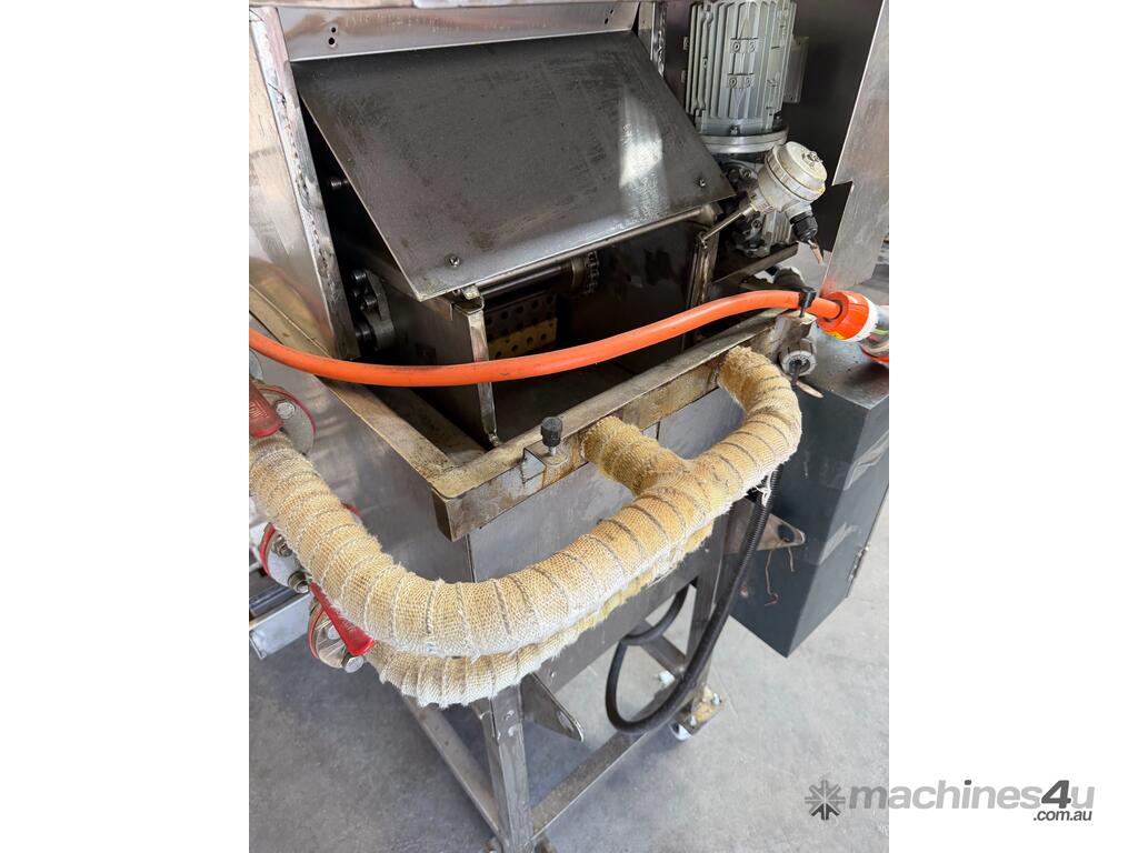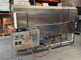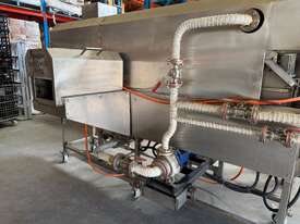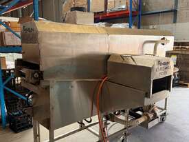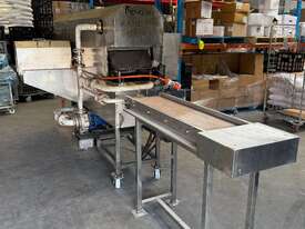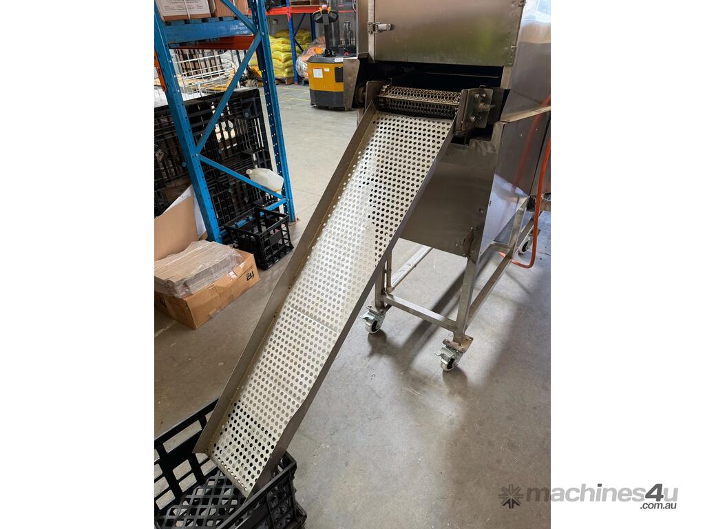• 3 conveyor belts. 1) to load the product, 2) top conveyor belt with flaps to push the product forward, 3) exit and drain off conveyor belt