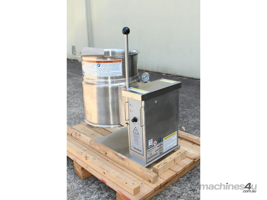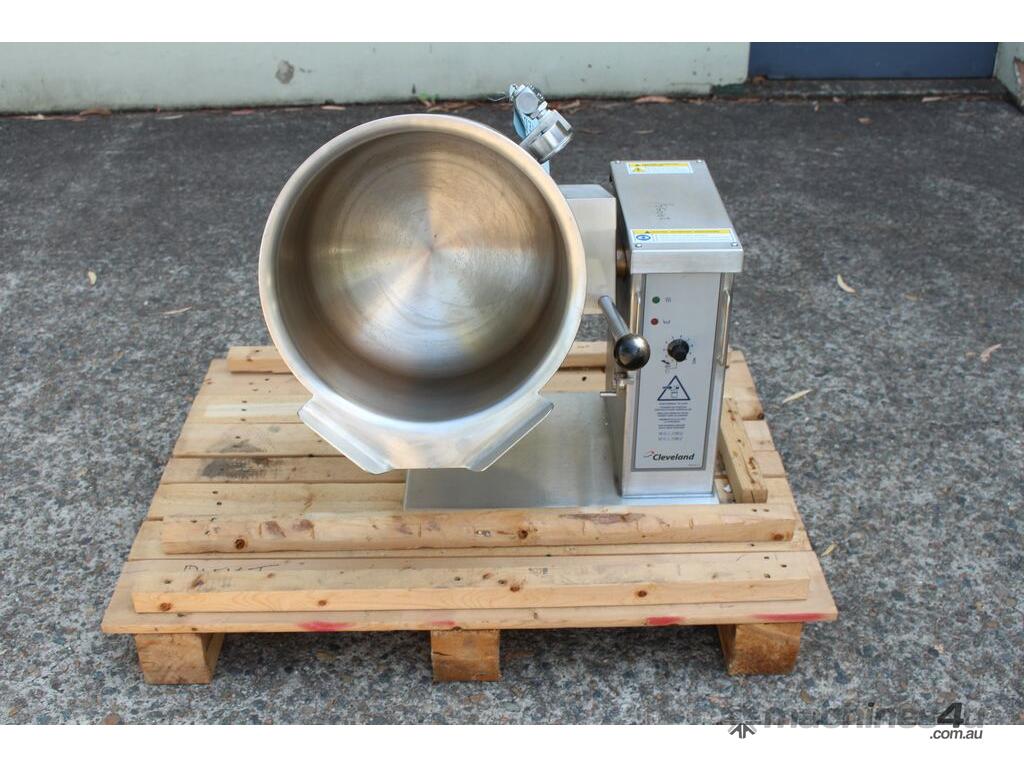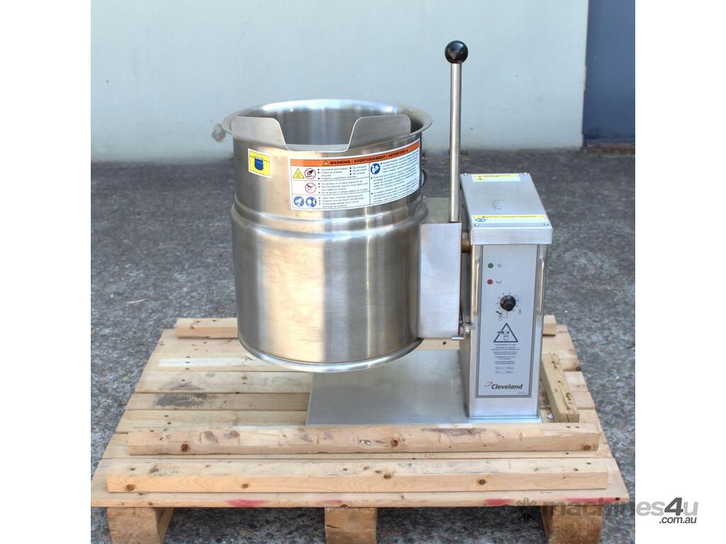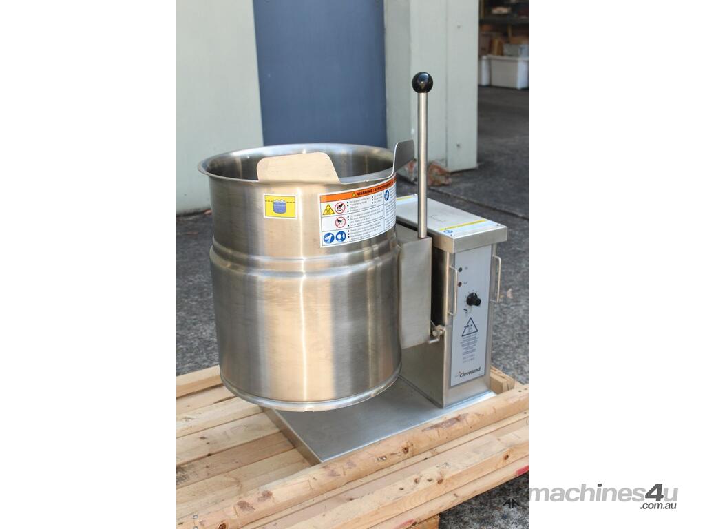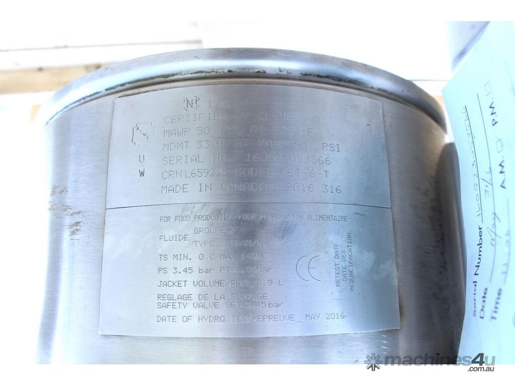 Electric Steam Tilting Kettle, "Cleveland" model KET-6-T, capacity 23L, internal dimensions: 340 dia x 270mm deep, open top, manual tilt, pouring lip, jacket working pressure 50psi, design temperature 298 deg F, 3 phase, overall dimensions: 610 x 432 x 572mm, manufacture year 2016