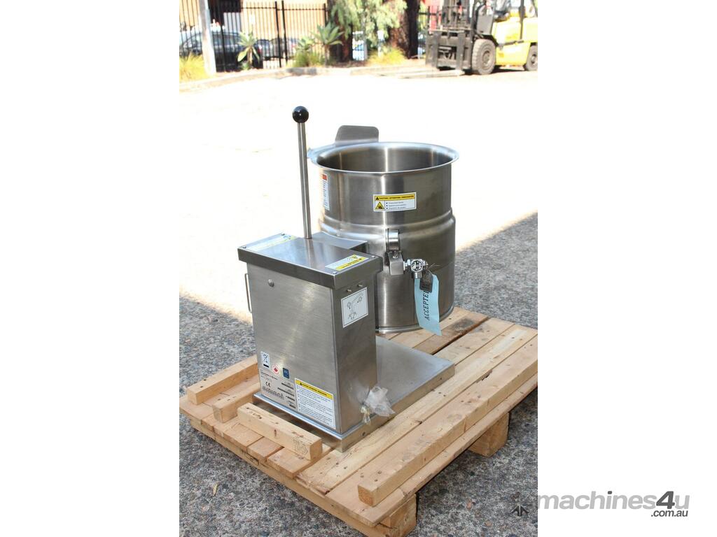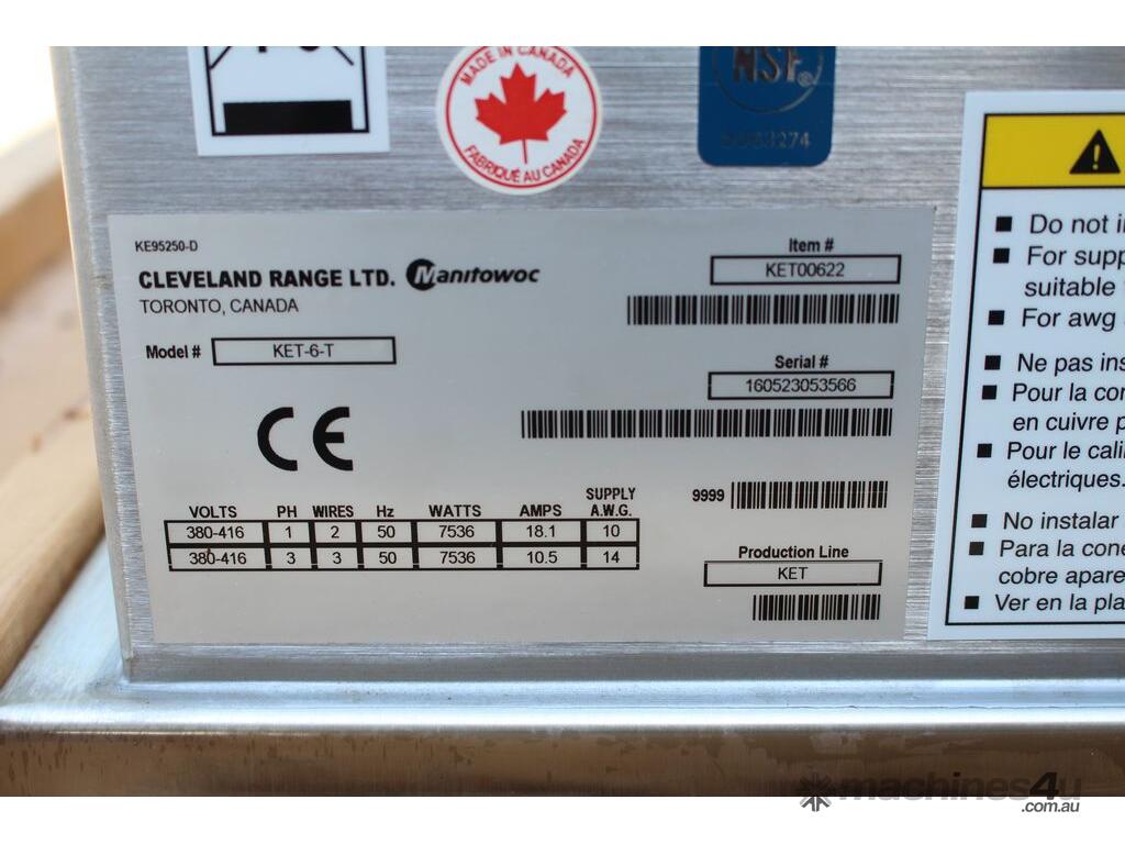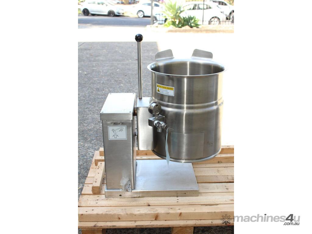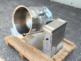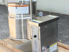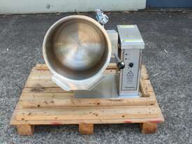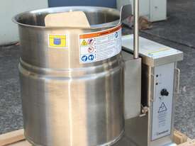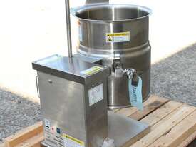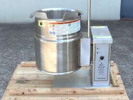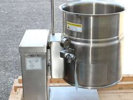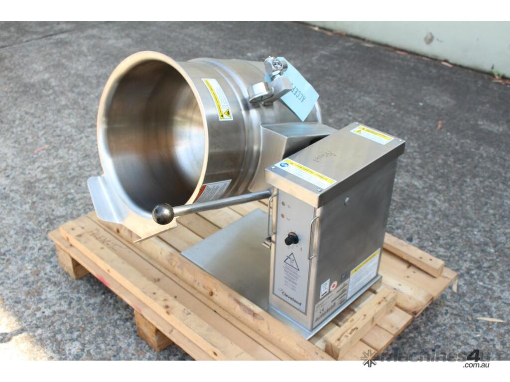 Electric Steam Tilting Kettle, "Cleveland" model KET-6-T, capacity 23L, internal dimensions: 340 dia x 270mm deep, open top, manual tilt, pouring lip, jacket working pressure 50psi, design temperature 298 deg F, 3 phase, overall dimensions: 610 x 432 x 572mm, manufacture year 2016