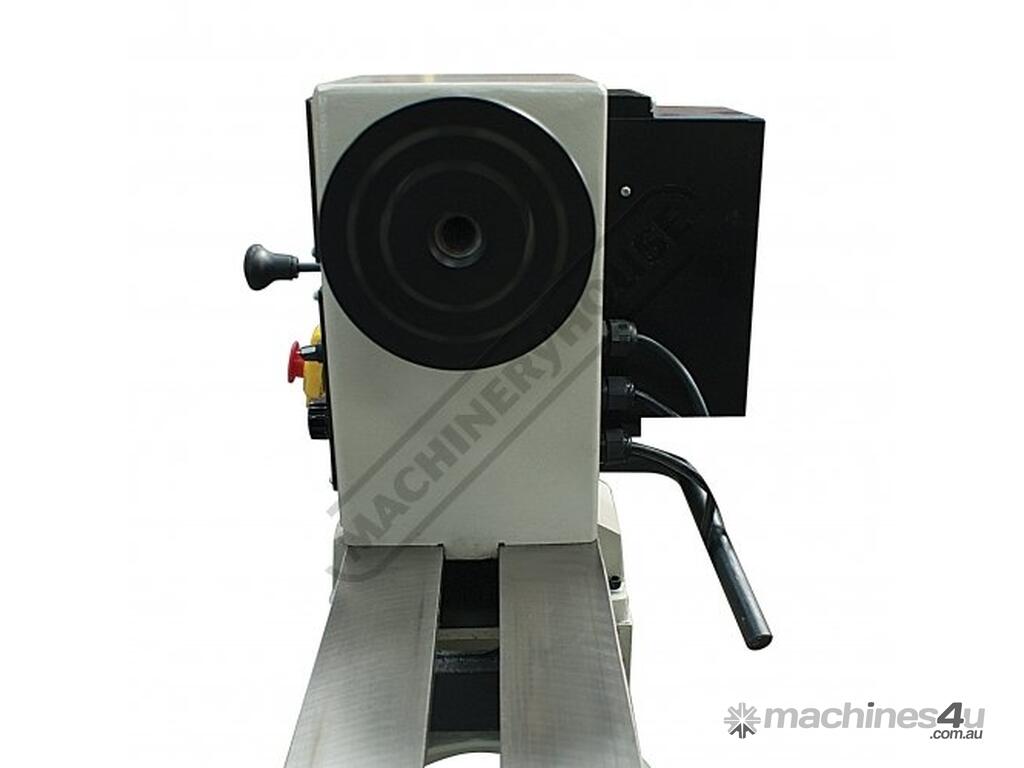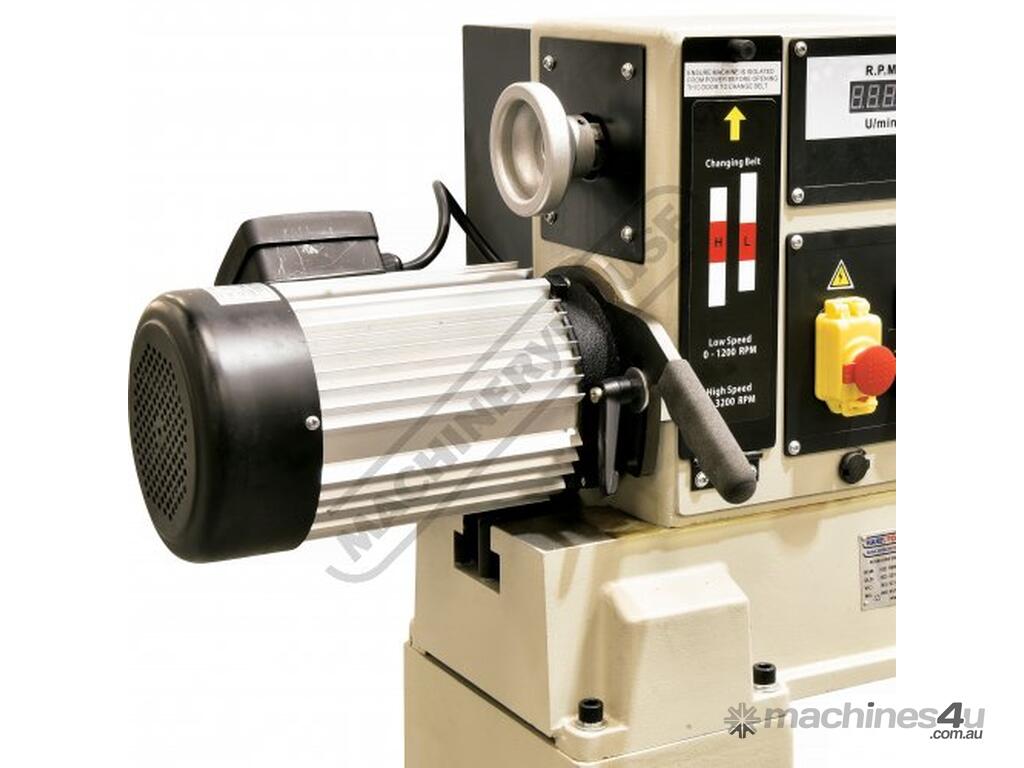 Power is provided by a 1.5kW / 2hp motor driving the spindle through a pair of pulleys and controlled by a variable speed control situated at front of the head. The low speed range provides plenty of torque for the big turning jobs whilst the high speed range allows the necessary adequate speeds for smaller components that's required for finishing.