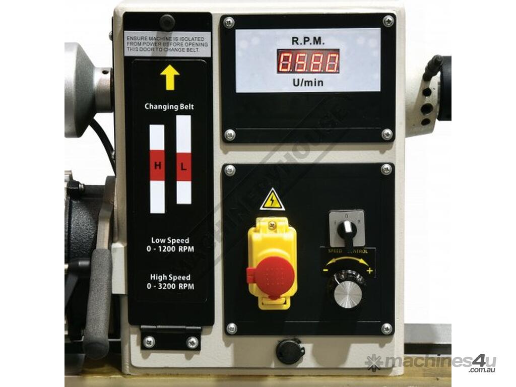 The front panel of the head has a digital rpm speed indicator, a safety on/off switch, a forward & reversing switch and an access panel for changing the belt pulley positions. Includes four prong drive centre, revolving tail centre, tool rest & faceplate.