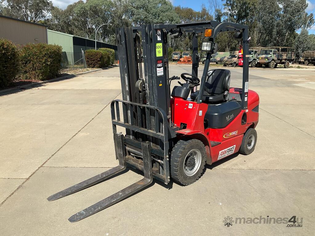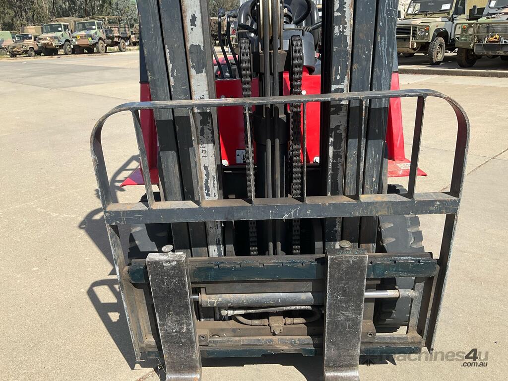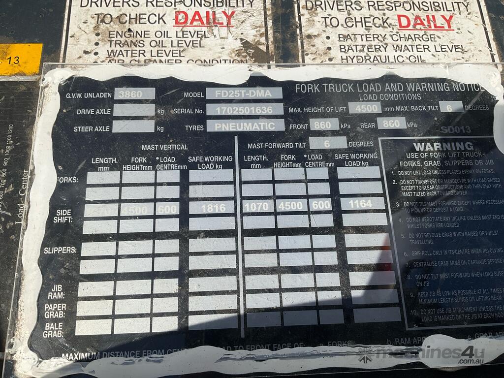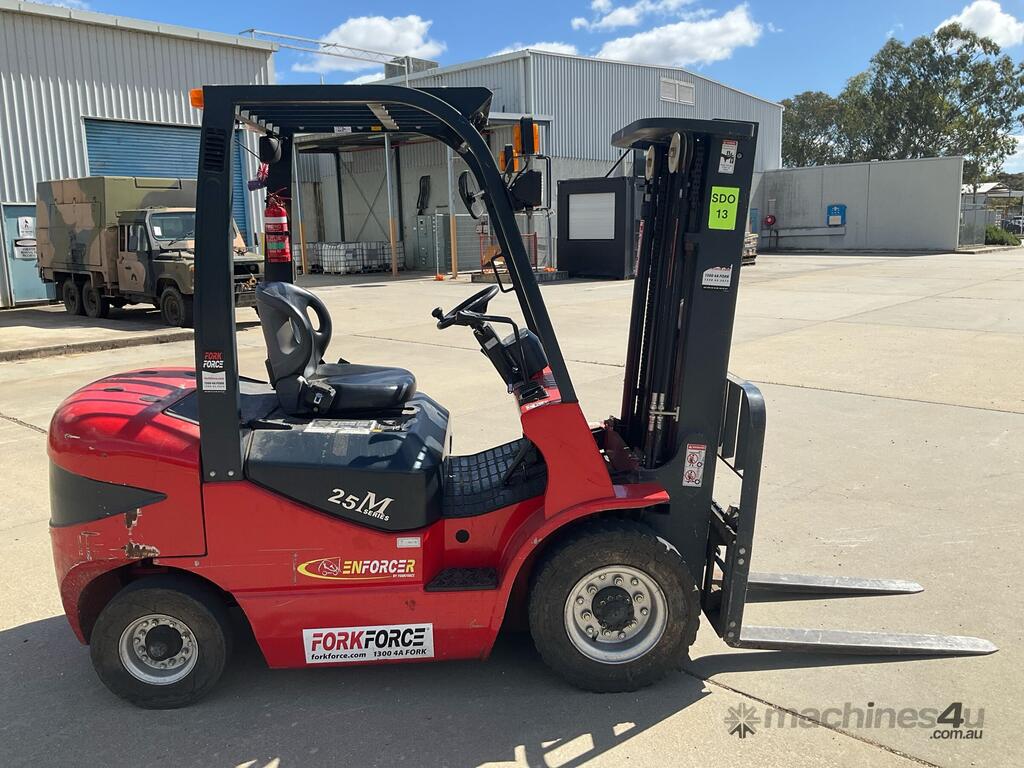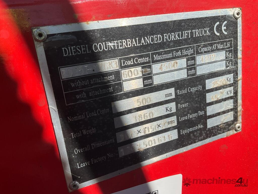 No C/P,Enforcer,FD25T-DMA,Forklift,4 Cyl,Diesel,Odometer not visible,733 (Hrs. Showing on Hour meter),Colour: Red,Rego. No: NP(SDO13), Unregistered,Serial No: A20D1700028,Sold with No Plates