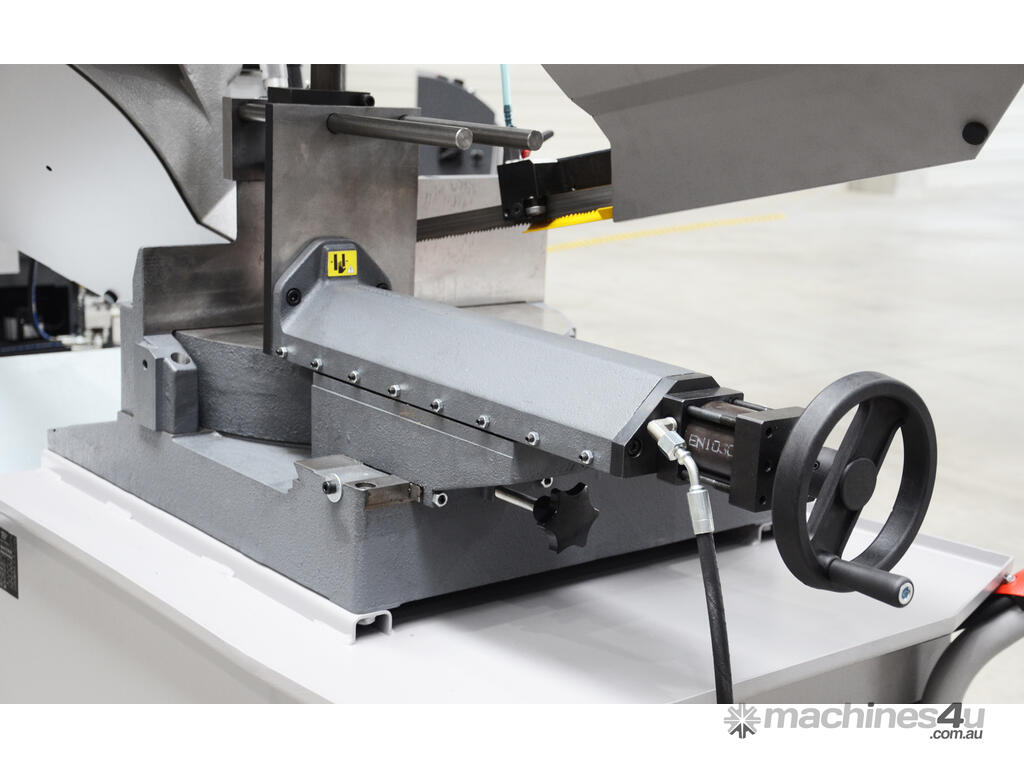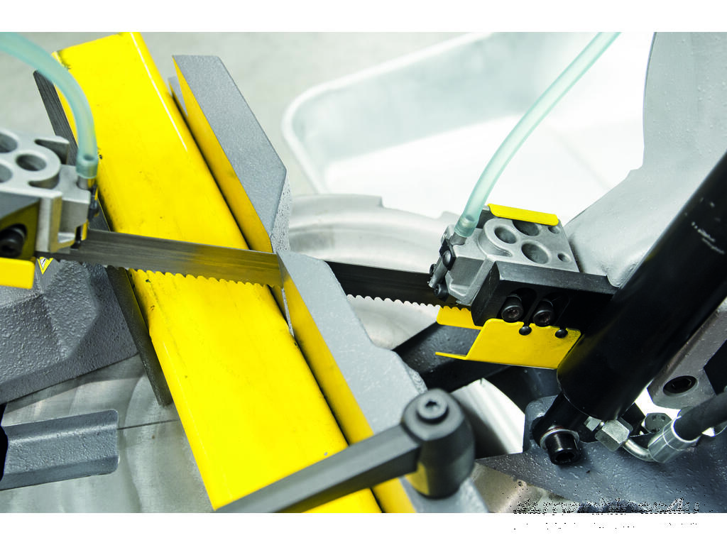 Precise hard metal saw band guides, saw head pivot embedded in pre-stressed conical bearings, a 27mm saw band and a syn-chronic swarf brush are the prerequisites for excellent cutting performance. The front-handled, very simple and fast angle adjustment for cuts in the range of -45° to +60° and a quick-acting vice with hydraulic clamping provide for a broad application range. The machine is equipped with a big feed table providing a good basis also for short pieces. The frame lifting and the cutting feed have hydraulic drive. The cutting feed can be adjusted on the control panel. The machine is equipped with an automatic cutting pressure regulation system. A coolant equipment in the machine base, a big ex-tractable swarf container with a dripping sieve (ecological disposal of dry swarf) Laser Liner, Variable Speed motor belongs to the standard equipment.