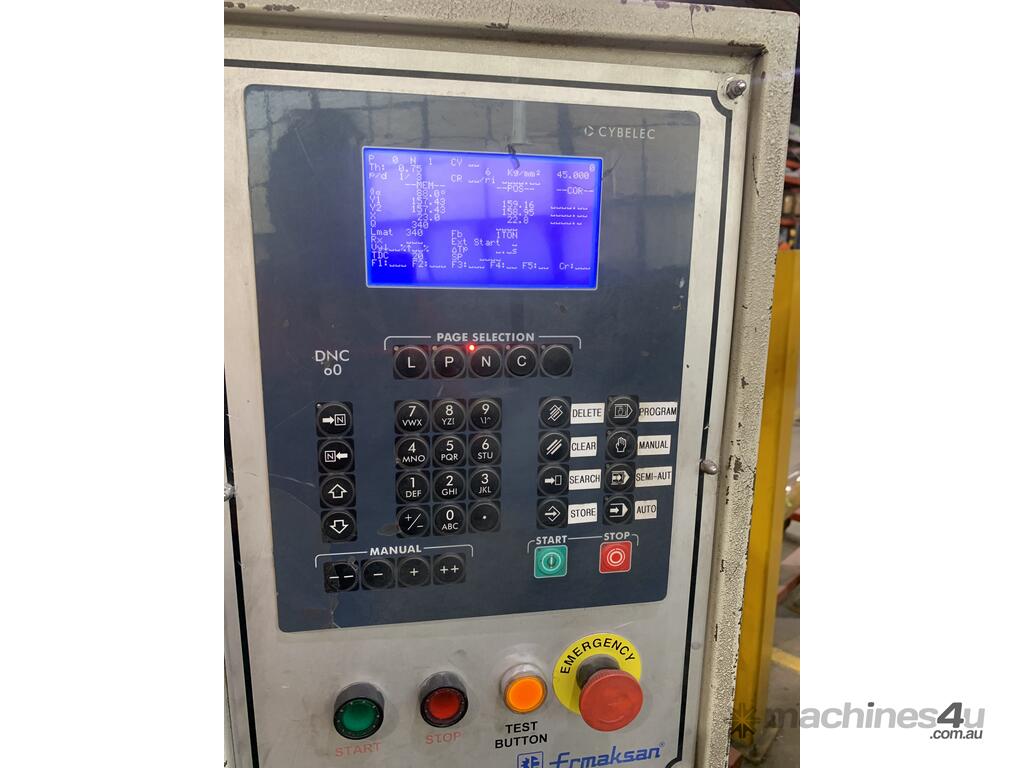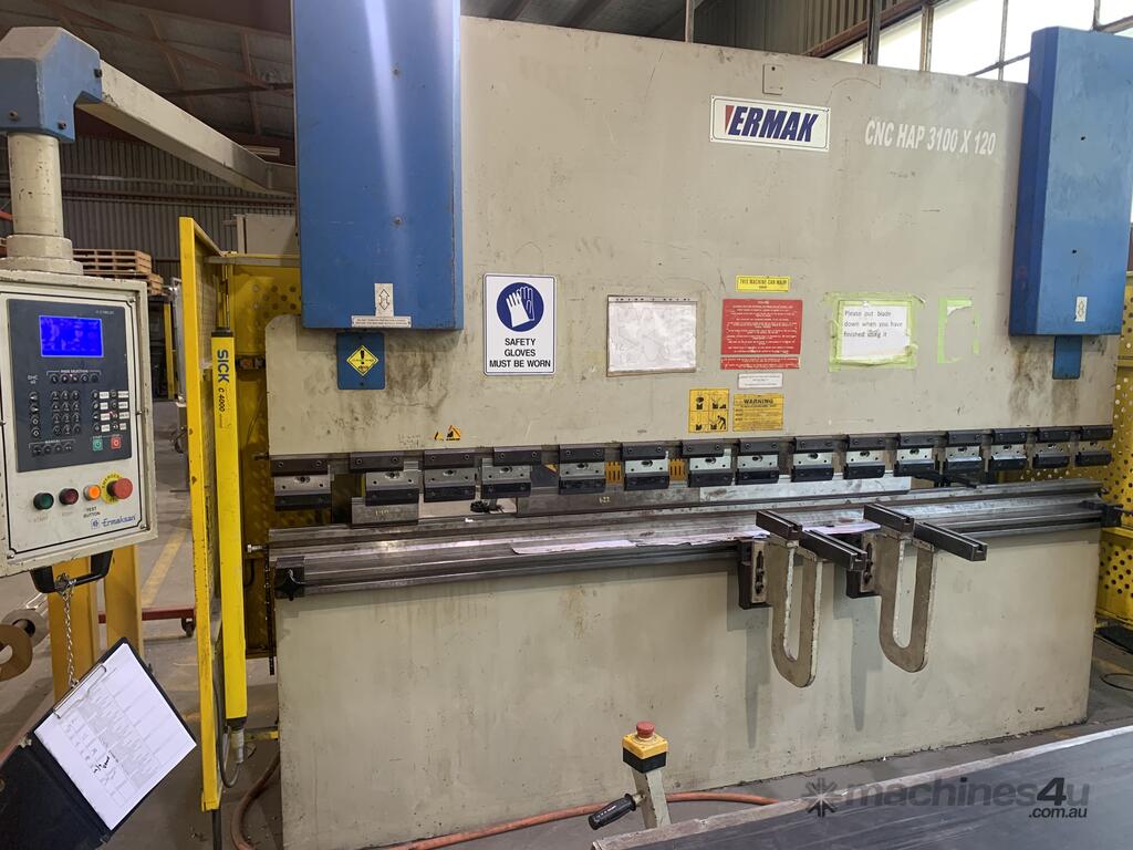Used Ermaksan 3 m x 120-ton 3 axes CNC press brake with Cybelec controller and tooling.