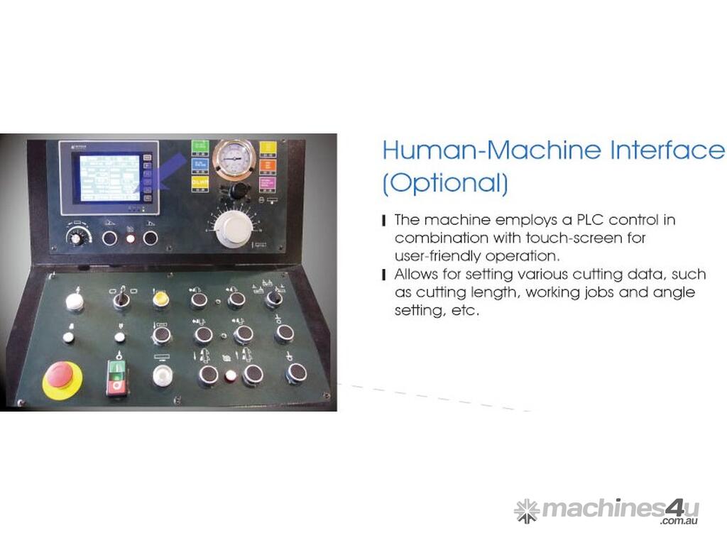 Automatic working system with power loading conveyor and HMI for input of cutting data such as length, working jobs and angle setting.