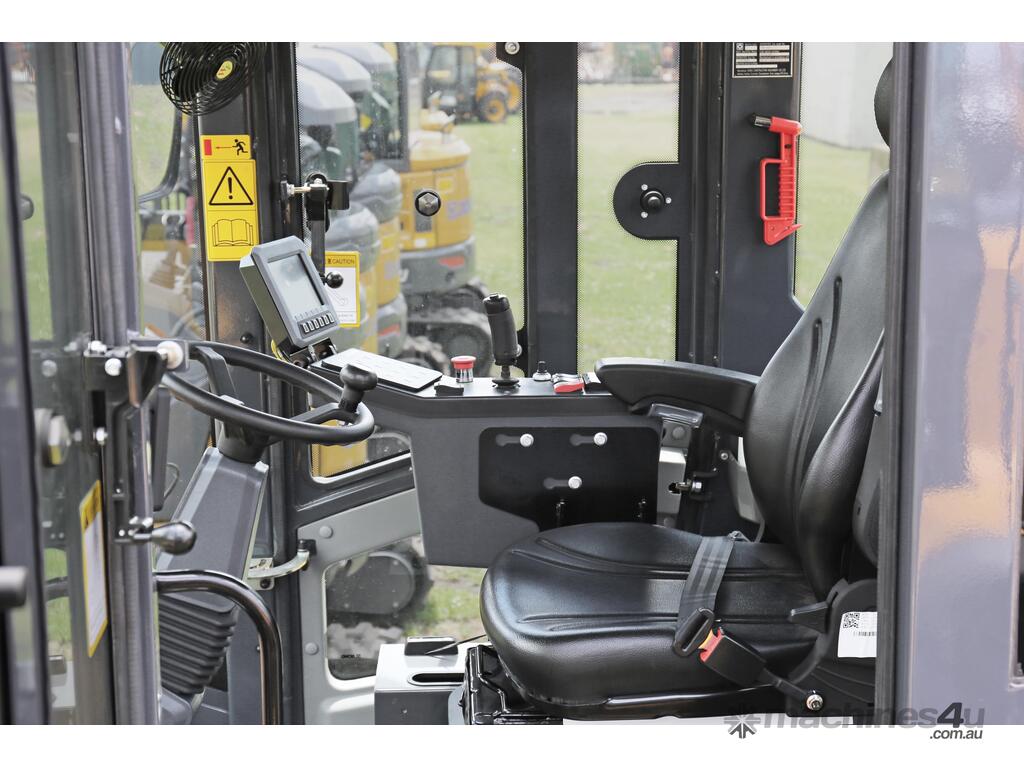 Ergonomic cabin with A/C, CANBUS joystick, integrated display, and suspension seat for comfortable operation.