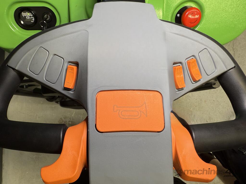 Safety features include an emergency stop switch and a neutral/off power mode. Our stacks use a Curtis / AC controller with “auto power off” for safety and energy saving.