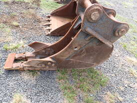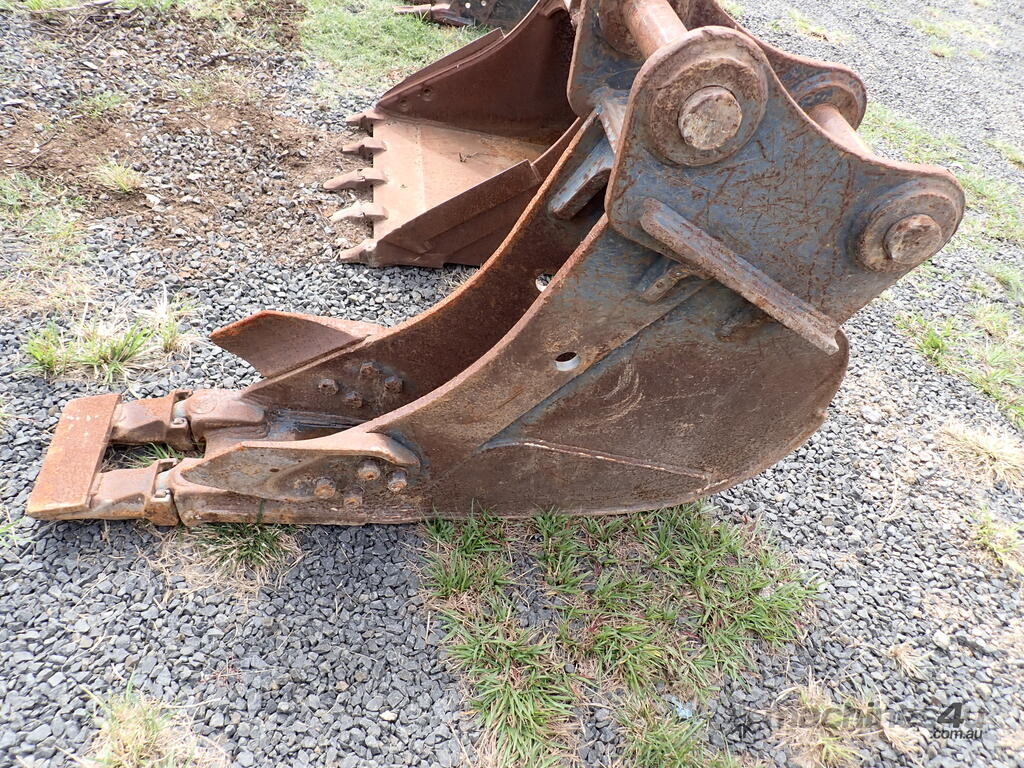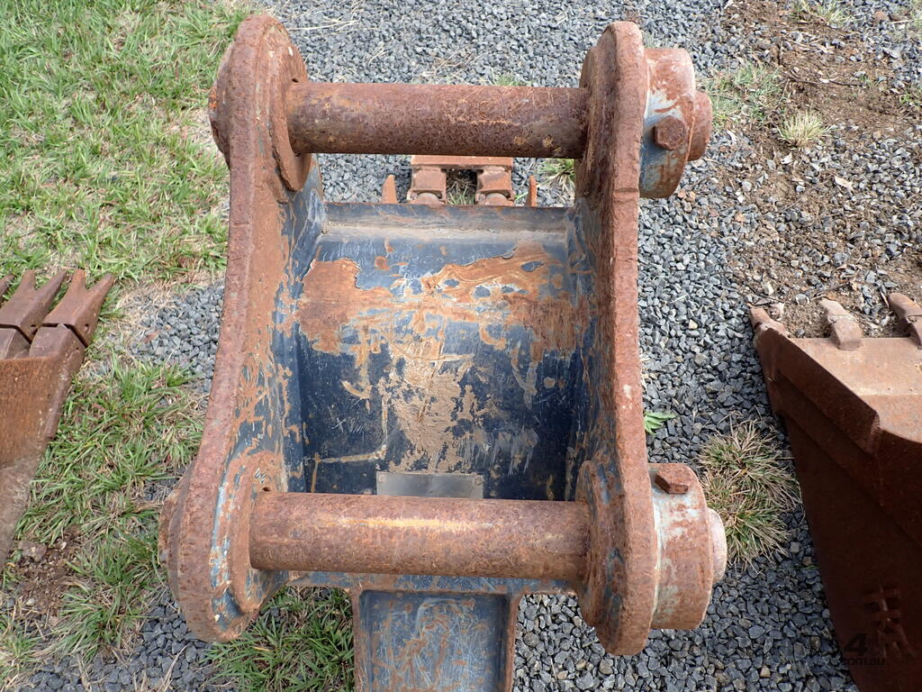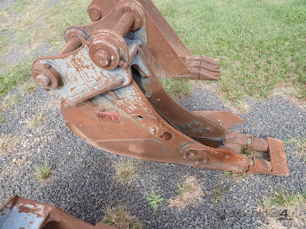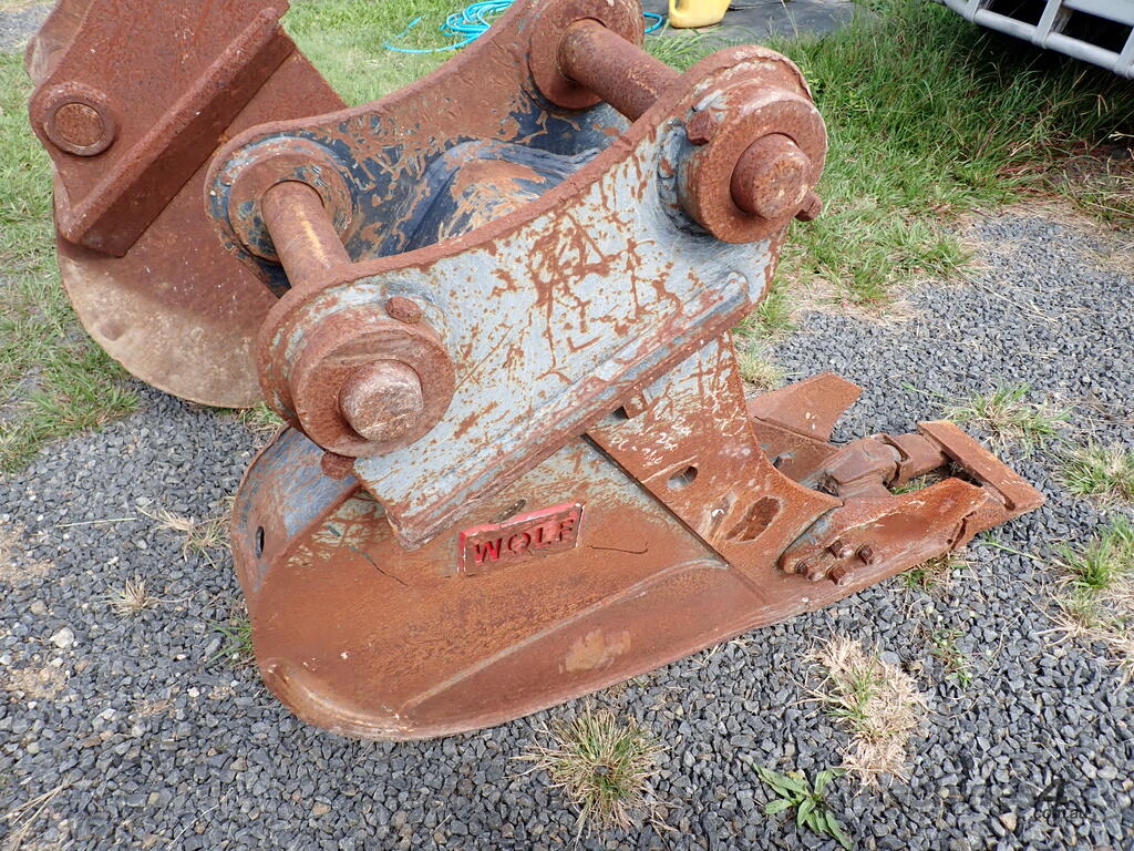 Excavator trenching bucket, Wolf brand, 320mm wide, 355mm pin centers, 255mm between ears, 65mm diameter pins, with teeth and side cutters, suit approximately 12 to 16 ton excavator or similar size machine, good solid bucket and is in very good condition.