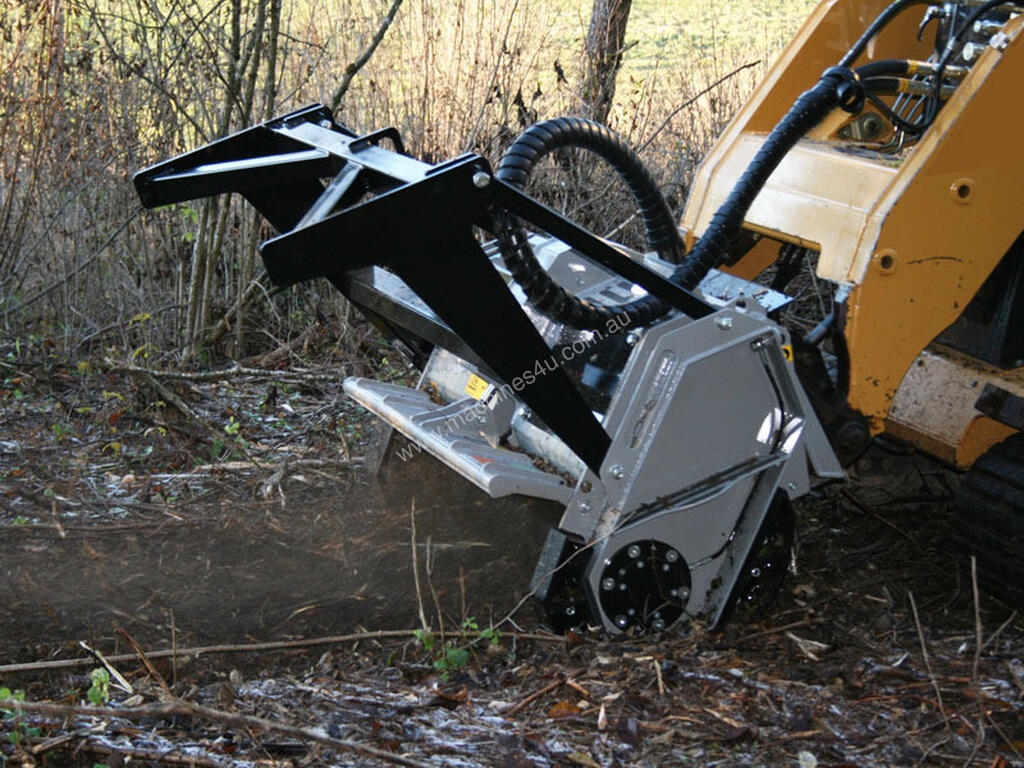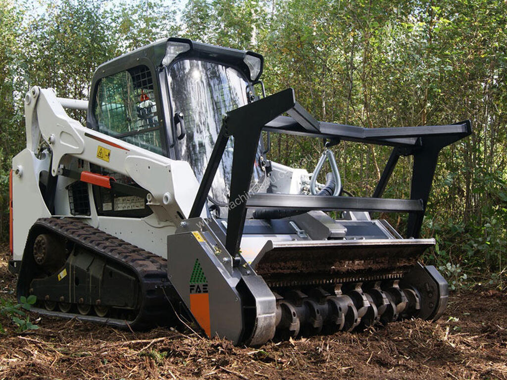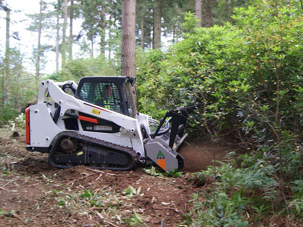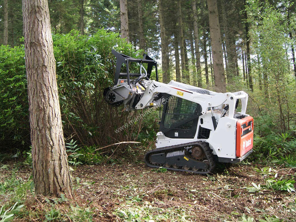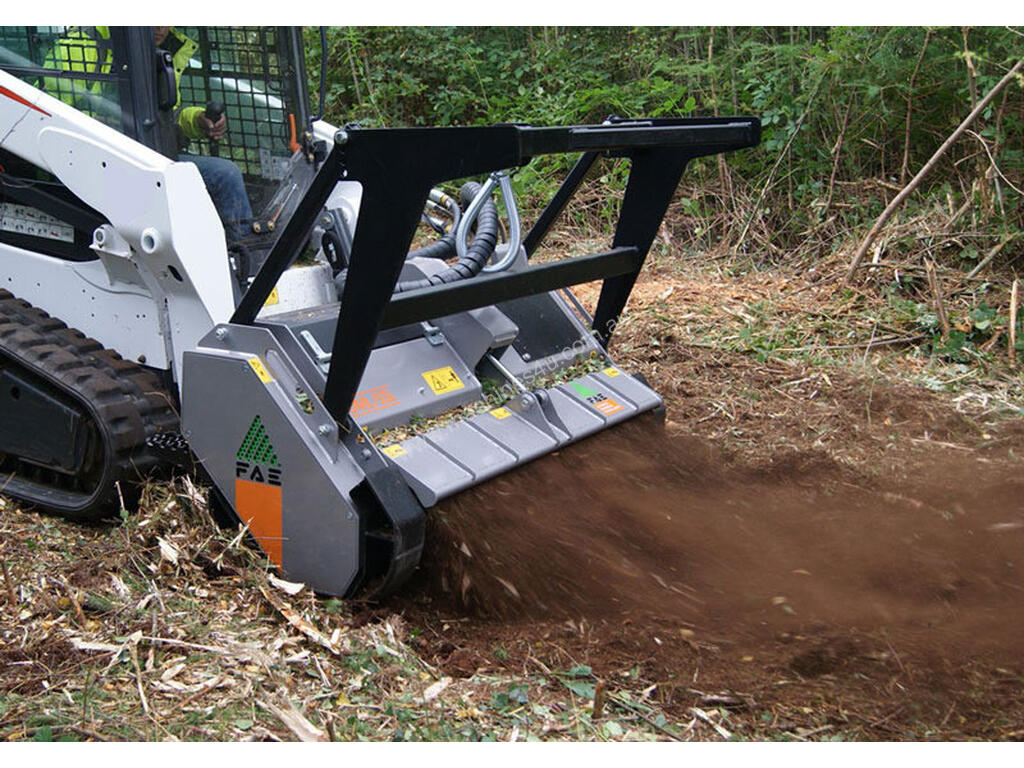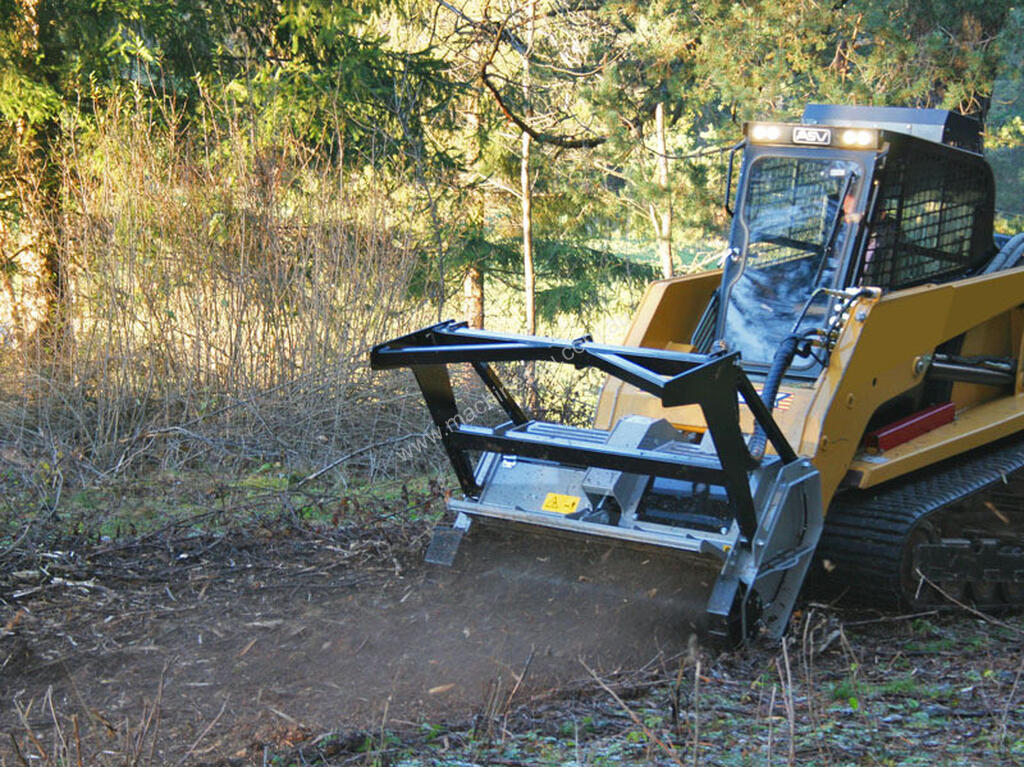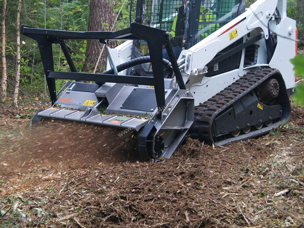 Description: Mulcher with fixed teeth rotor for skid steer loaders between 40 and 70 HP.