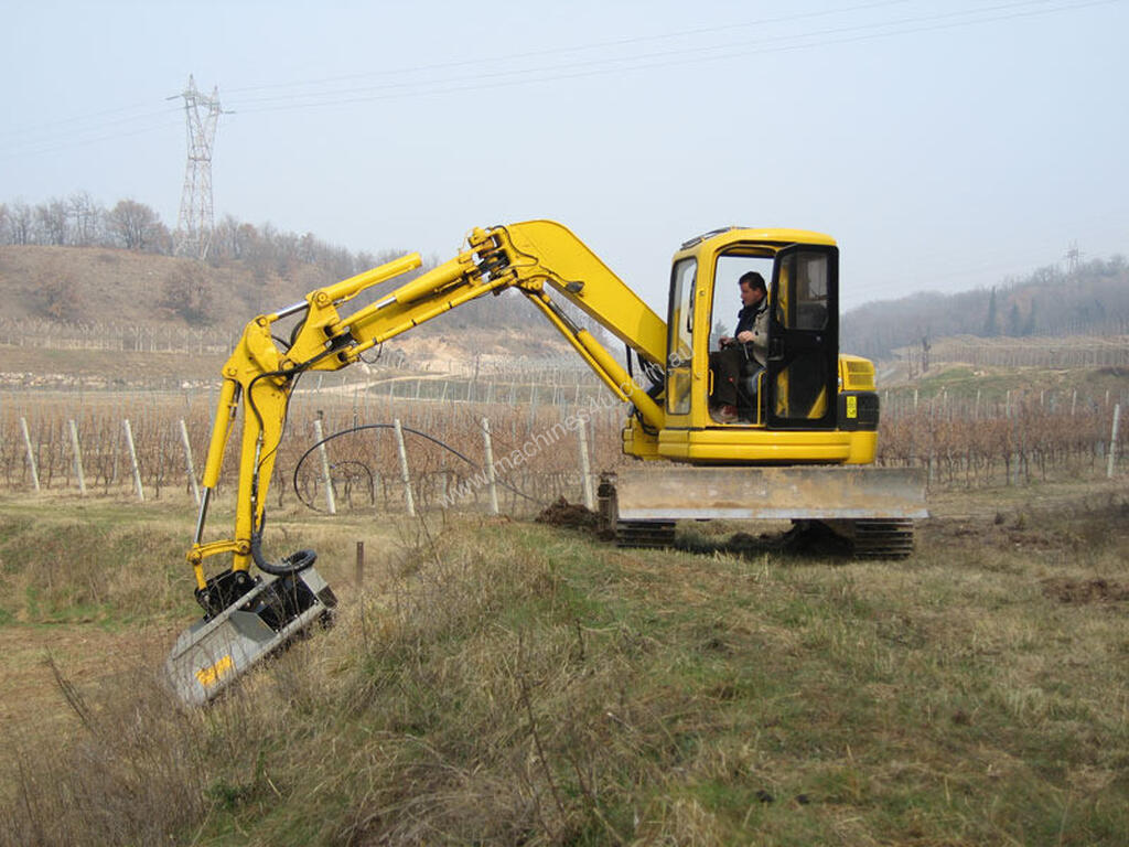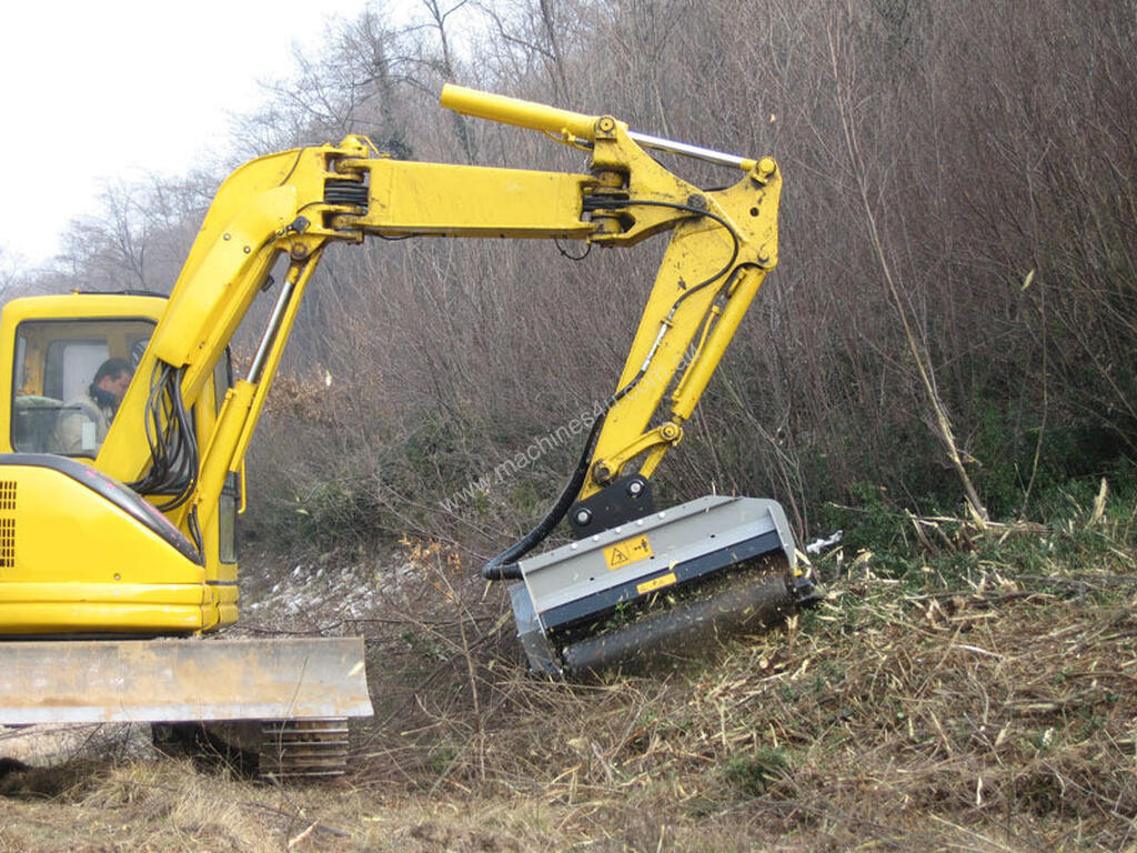 Designed for underbrush, grass and bushes. It comes equipped with a variable displacement hydraulic piston motor. The optional stronger bearing for the back roller ensures best performance and maximum reliability when working on uneven terrain. The flow control valve allows easy mounting to the excavator without the need to adjust the flow (the valve will work automatically depending on the excavator). It can be equipped with flails or hammers for different types of applications.