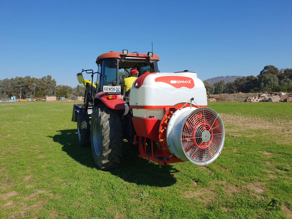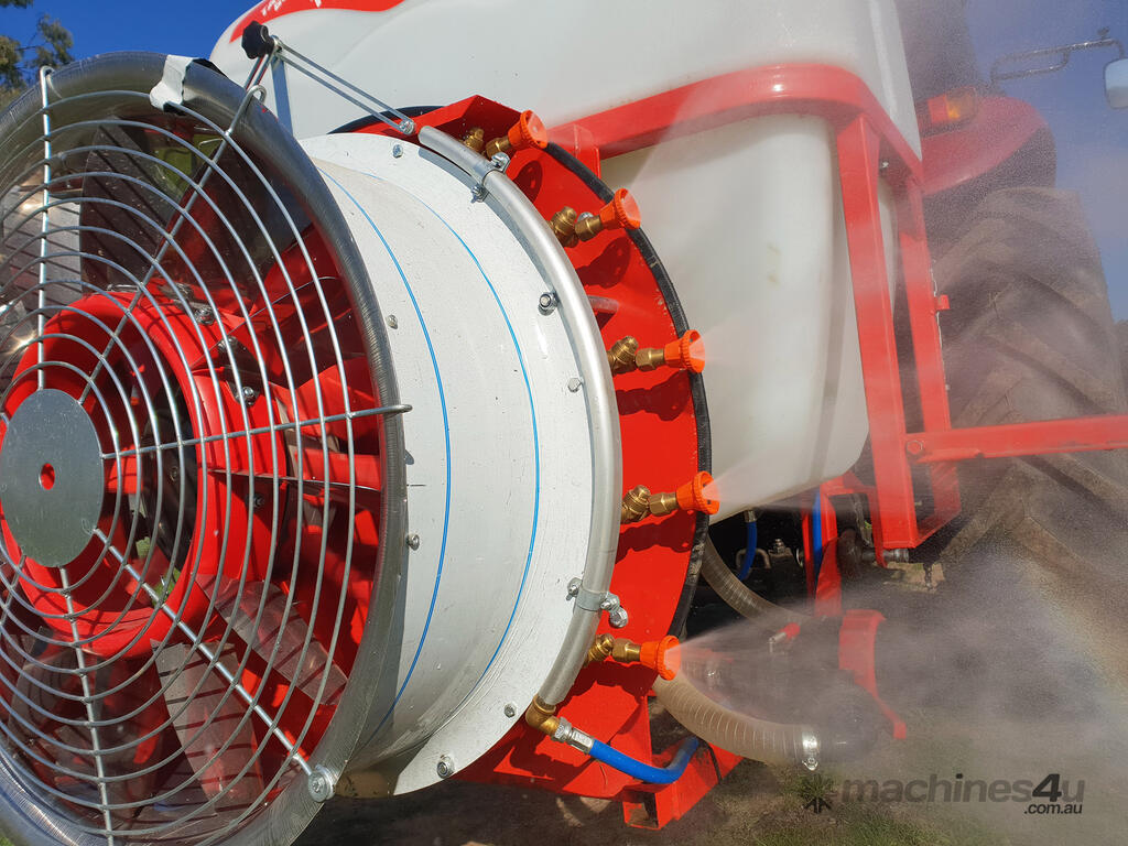Airblast mister for vineyards and orchards with adjustable nozzles for good crop coverage.