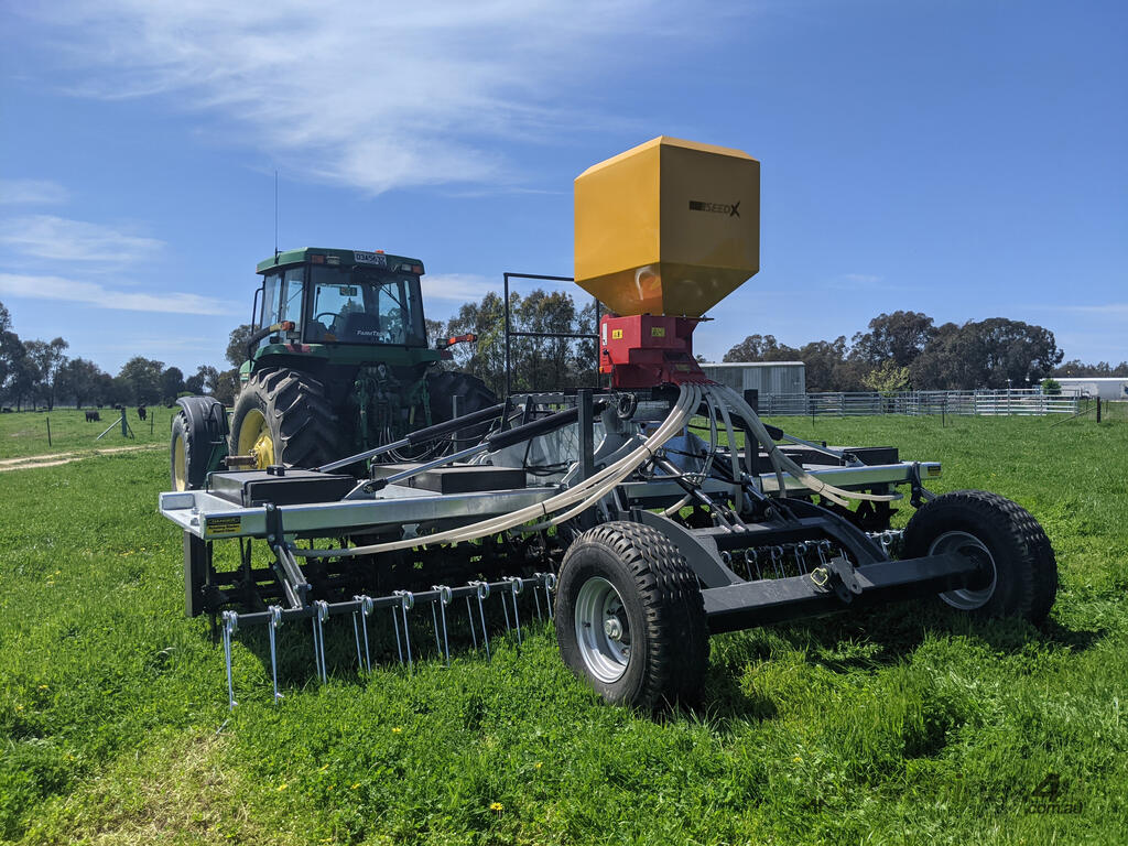 This machine can be paired with any vehicle with a 12V power source that powers Twin high-capacity air fans, to blow the seed through the supplied hoses.