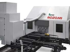 The NOZOMI can be installed in line with CNC beam drill lines, creating a highly efficient automated structural steel fabrication cell.
